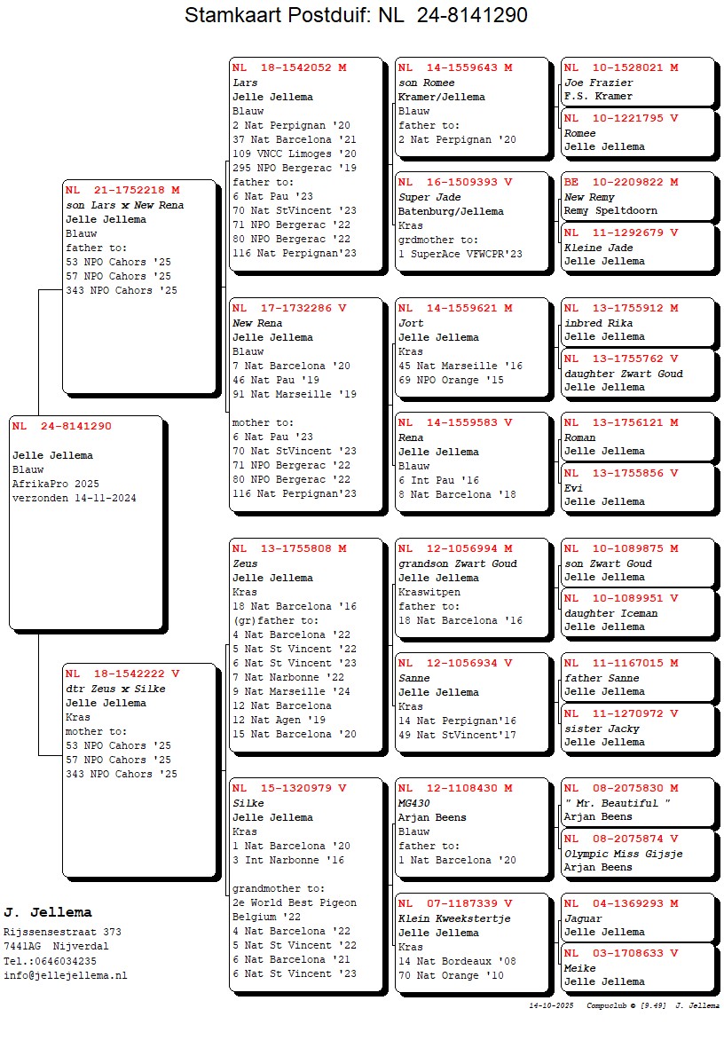 LOT 15 AFRIKAPRO AUCTION 4 – Jelle Jellema-NL-24-8141290 -SIRE:NL 21-1752218 M son Lars x New Rena Jelle Jellema.Blauw father to: 53 NPO Cahors ’25, 57 NPO Cahors ’25, 343 NPO Cahors ’25.———–DAM:18-1542222 V dtr Zeus x Silke Jelle Jellema Kras mother to: 53 NPO Cahors ’25, 57 NPO Cahors ’25, 343 NPO Cahors ’25.SEE PEDIGREE!!!!
