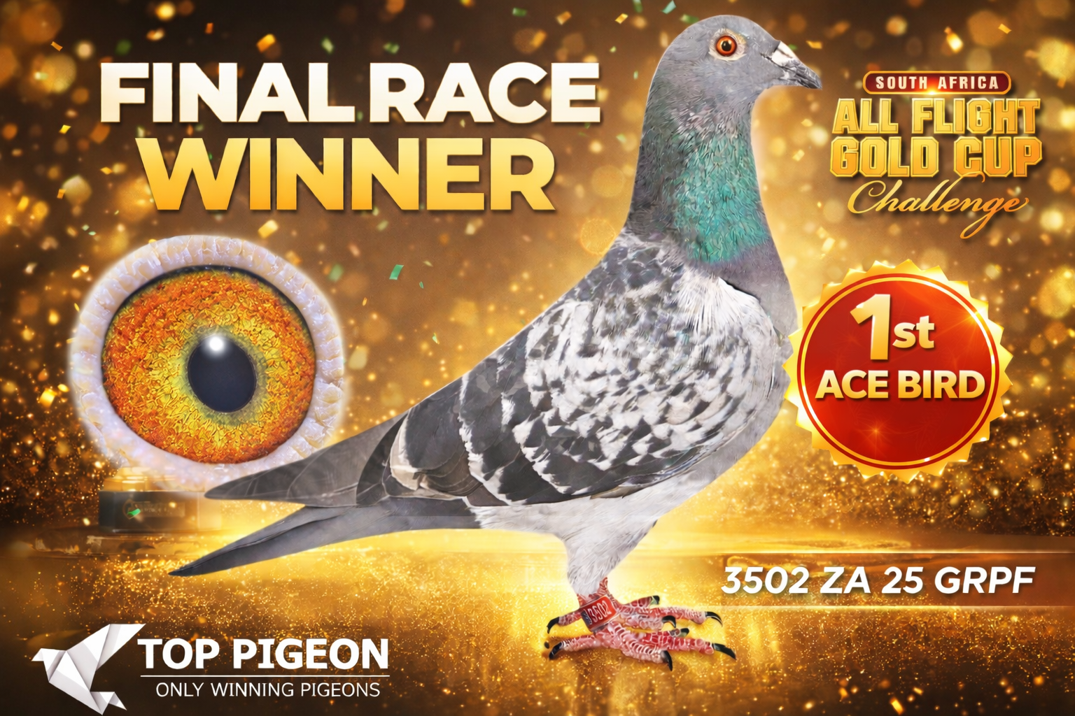 LOT 15 CARNIVAL ALL FLIGHT GOLD CUP -Greg Anderson-GRPF 25 3502 -FINAL RACE WINNER AND 1ST ACE BIRD WINNING A TOTAL OF R175 000.00——–SIRE:366 TRPF 24. HARRY WILLSON. JELLEMA / GANUS. 5TH FINAL CARNIVAL SUMMER 2025. 3RD ACE BIRD CARNIVAL SUMMER 2025.————-DAM:037 HILLCREST 24 HILLCREST HYPE GRIZ 4TH PLACE CARNIVAL GOLD CUP 2025, WINNING R40 000, 4 MINS ,11 SECONDS BEHIND THE WINNER , 2ND ACE BIRD FROM INITIAL ENTRY OF 337, WINNING R15 000.SEE PEDIGREE!!!!