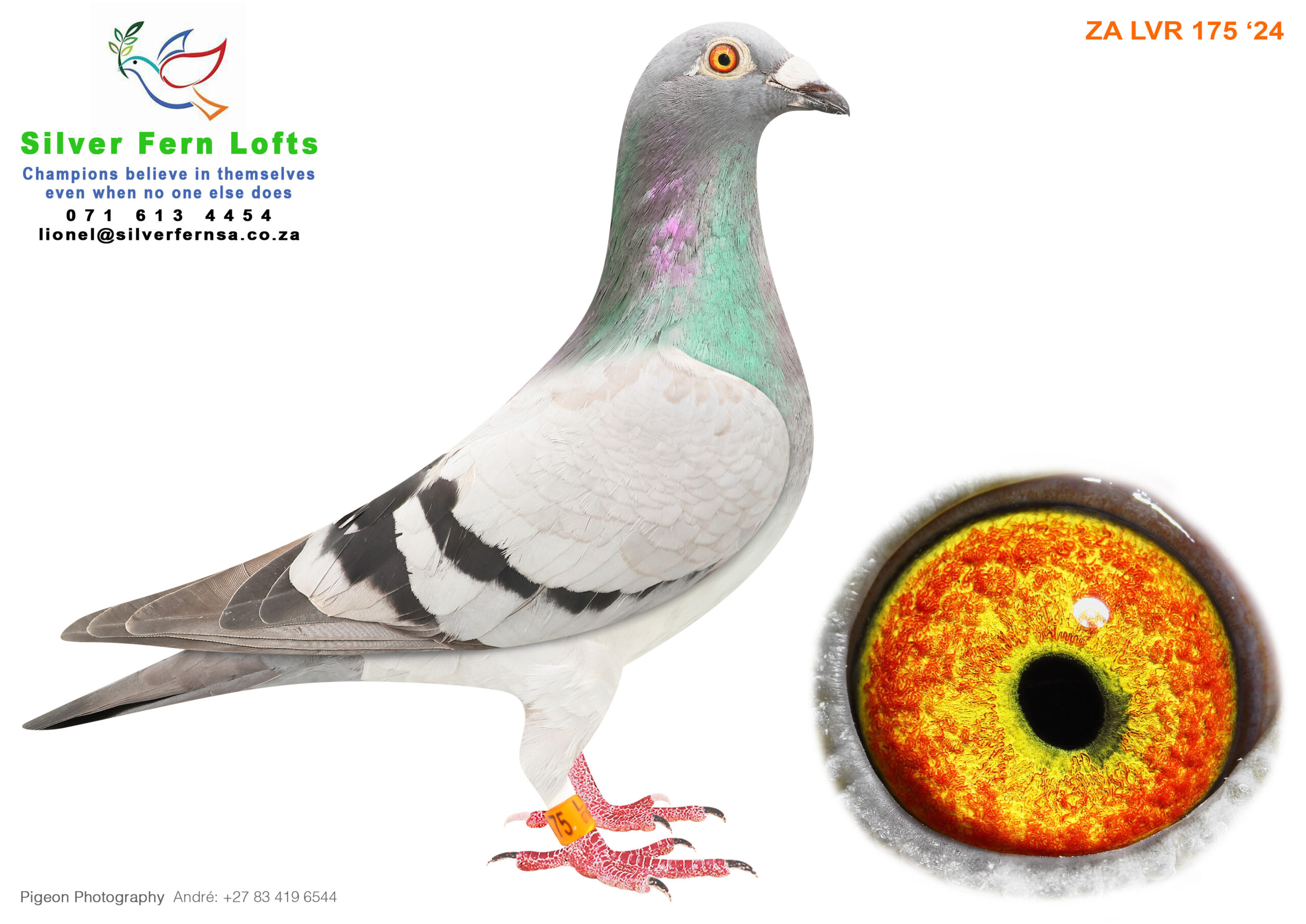 LOT 15 KITTEL AUCTION – ZA 24 LVR 175 -SIRE:ZA 24 LVR 175 is a Blue Bar cock bred from elite Dirk Van Den Bulck × Sangers genetics, heavily linebred to the world-famous KITTEL (1st National Ace KBDB 2013) — widely regarded as one of the greatest sprint pigeons in history. This line carries “HYPER EXCLUSIVE” genetics, including BANKSY (KITTEL x his mother OLYMPIC ROSITA), making it an exceptionally tight concentration of proven champion blood. The influence of OLYMPIC ROSITA (1st Olympic Ace Bird) is strongly present, reinforcing elite performance and breeding consistency.————–DAM:438 ZA 21 ABL .Blue Chequer Pied hen combining Alwyn Bester and Dirk Van Den Bulck bloodlines, built on some of the strongest imported and proven South African breeding foundations. She originates from a super breeding Andre Roodhooft hen, whose lineage has produced multiple TRPF winners, confirming her class as a top producer. The pedigree further strengthens through linebreeding to KITTEL, including descendants such as ANGELINA (full sister to KITTEL and GOLD DUST) and KATU (half-brother to KITTEL).SEE PEDIGREE!!!