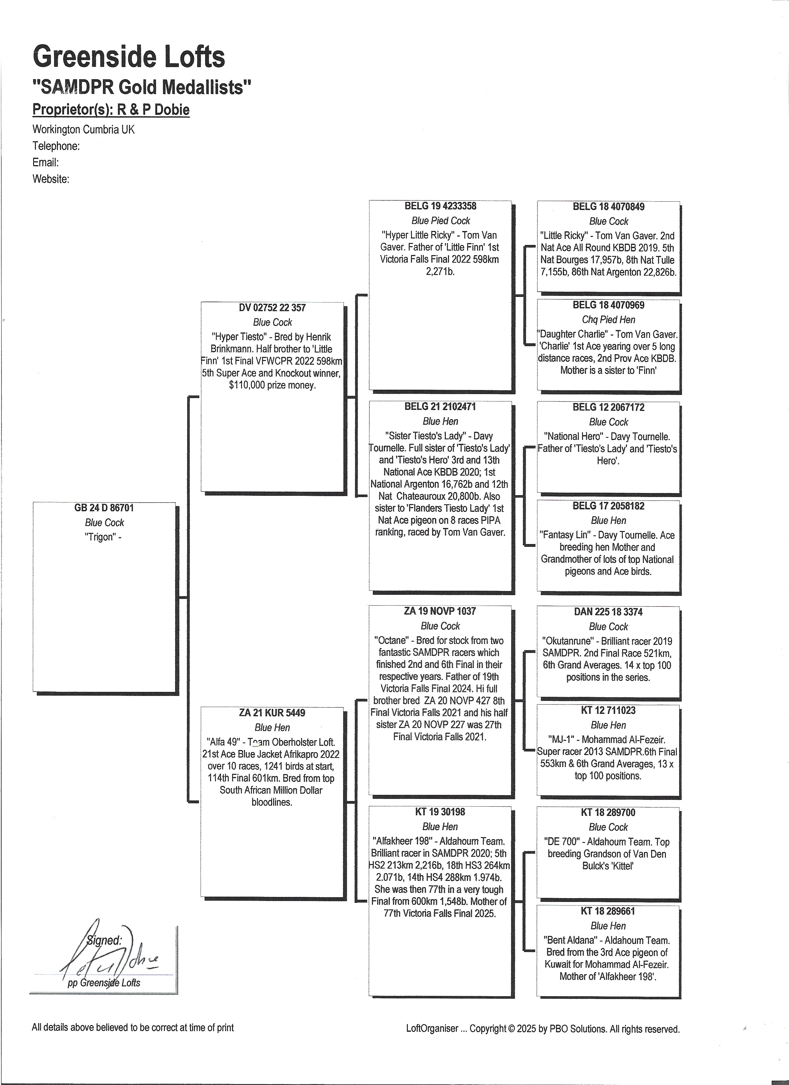 LOT 29 AFRIKAPRO AUCTION 2 – Die Painters & SG Ullrich-ZA-24-KPU-2304 -Great racer at AFRIKAPRO 2025 – 68th BLUE JACKET OVERALL! Directly out of two superbreeders!! Same father as the breeder of AFRIKAPRO FINAL RACE WINNER 2025!! Same mother as AFRIKAPRO GREEN JACKET WINNER 2024!!! “SKAAM COCK” is father to: “DUAL PURPOSE” – Father to 1st FINAL RACE AFRIKAPRO 2025!!! Himself a 2nd National Ace Pigeon and SANPO SILVER MEDAL SHORT DISTANCE 2019 “GOLD MEDAL LASS” 1st National Ace Pigeon Short Distance 2024 “PRIME LASS” Leader of the prestigious Blue Jacket Ace Pigeon Series at Afrikapro 2024 after Race 7. “SHY LASS” who won 1st Knockout Dinokeng OLR in 2021. She was also 3rd Overall Ace Pigeon during the same year. “SUPREME LASS” our super racer 7 X 1st, Combine Winner, Union Winner etc. “MORPHO” – sire to 1st TRPF YB Ace 2024 Mother of “DA VINCI” is “CASSIUS KATELYN” who is also the mother to the AFRIKAPRO GREEN JACKET WINNER 2024.SEE PEDIGREE!!!