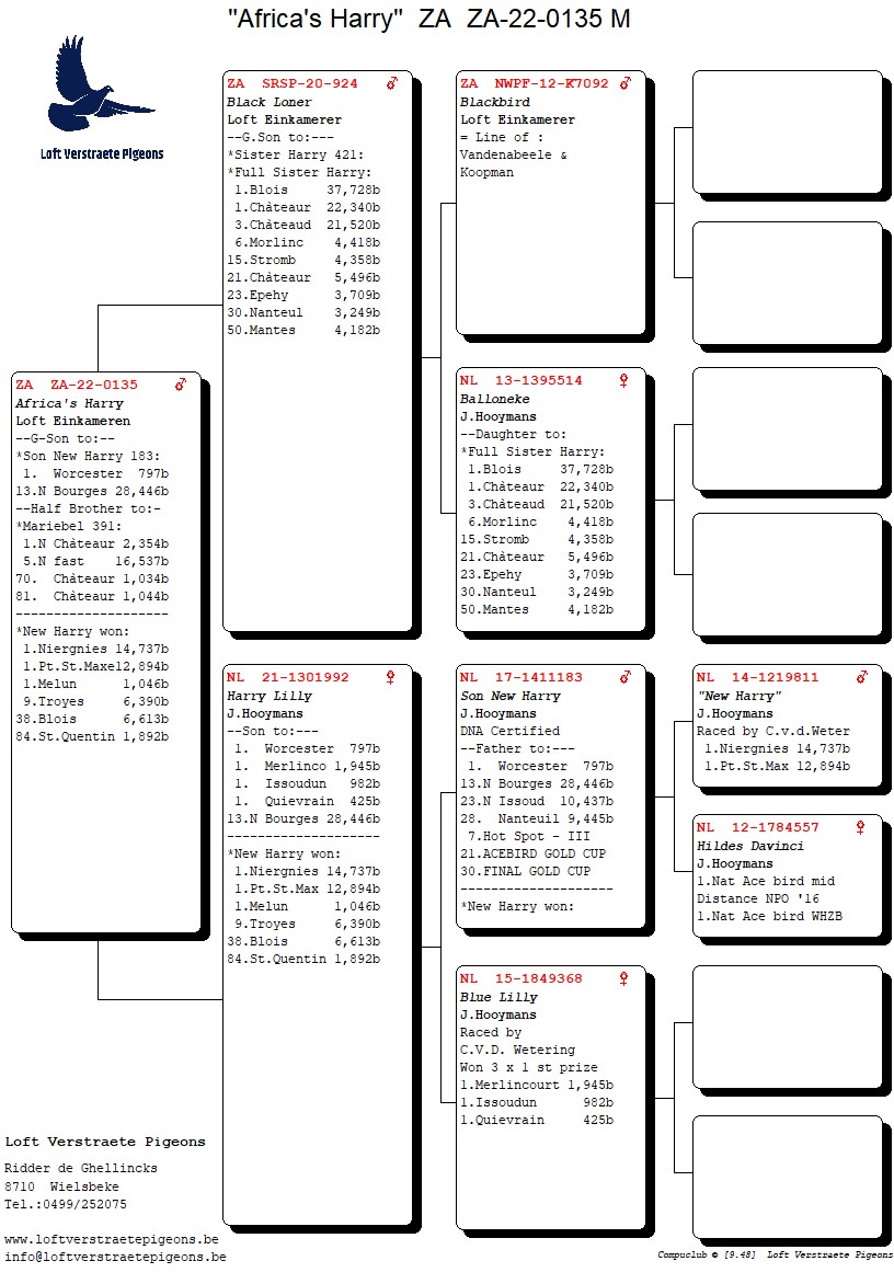 LOT 16 LOFT VERSTRAETE – ZA 22 0135 -Sire: ZA SRSP-20-924 – Black Loner Direct from Loft Einkamerer Top Hooymans / Harry family bloodline. Full brother to “Harry 421” Brother to the mother of “Full Sister Harry” – a hen responsible for outstanding performances: 1st Blois vs 37,728 birds 1st Châteauroux vs 22,340 birds 3rd Châteaudun vs 21,520 birds 6th Morlincourt vs 4,418 birds 15th Strombeek vs 4,358 birds 21st Châteauroux vs 5,496 birds 23rd Ephey vs 3,709 birds 30th Nanteuil vs 3,249 birds 50th Mantes vs 4,182 birds Grandson of “Blackbird” – a direct line of the legendary Vandenabeele × Koopman crossing, known for producing elite middle-distance champions. A proven genetic source of the world-famous Harry dynasty.—————-Dam: NL 21-1301992 – “Harry Lilly” Direct J. Hooymans hen from the Harry family Outstanding breeding hen from the New Harry line. Daughter of NL17-1411183 – Son New Harry (DNA Certified).SEE PEDIGREE!!!!