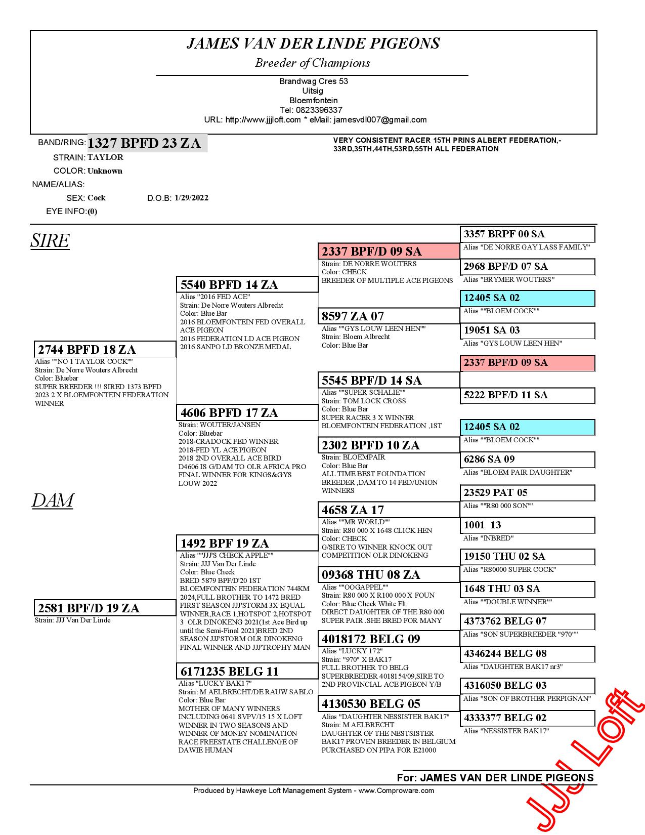 LOT 16 WACKY WEDNESDAY – ZA 23 BPFD 1327 – SIRE:2744 BPFD 18 ZA “No.1 Taylor Cock”, a super breeder already responsible for multiple Bloemfontein Federation winners, confirming his class both on the road and in the breeding loft. He carries the renowned De Norre Wouters Albrecht / Taylor bloodlines, known for consistency and durability.———-DAM:2581 ZA 19 BPFD. built from elite JJ Van der Linde and top Belgian bloodlines. Her sire, 1492 BPF 19 ZA “JJJ’s Check Apple”, is a top breeder, responsible for: 🥇 1st Bloemfontein Federation (744 km, 2024) Full brother to multiple hotspot and final winners at Dinokeng OLR This line traces back to: 09368 THU 08 ZA (“Oogappel”) – direct daughter of the legendary R80,000 Super Pair 4018172 BELG 09 “Lucky 172” – direct super breeder from Bak 17 line.SEE PEDIGREE!!!!