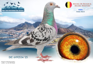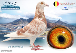.LOT 6 CAPETOWN LOFTS – Riaan Louw Team Vision 2-ZA-BDUD-25-696### -6TH FINAL RACE R15 000.00—-7TH ACE BIRD——SIRE:6145670 BE 23. STEFAAN LAMBRECHT/VAN DEN BULCK.———–DAM:04711 ZA GPU 17.TOM LOCK CROSS.THIS IS MY BEST STOCK HEN EVER. SHE BRED ME 4 BABIES IN 2023. ONE IS TRIPPLE FEDERATION WINNER AND 2 TIME TRUCK WINNER. TWO SISTERS ARE TRUCK WINNERS TOO. THE BROTHER IVE PUT TO STOCK AFTER 3 SISTERS ALL..SEEPEDIGREE!!!!