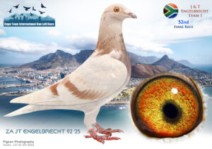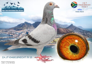 .LOT 8 CAPETOWN LOFTS – Triple J Lofts Team 2-ZA-JJJ-25-112*** -8th Final Race , 6th Ace Bird , 3rd HS4 EQUAL WINNER , 8th HS1 EQUAL WINNER———–Sire: ‘GOLDEN JETT’ ZA 2022 JJJ 201 Notes: Bred for Stock from 1st 2022 Cape Town International Summer Final & 1st 2022 All flight Gold Cup Summer Final!! GOLDEN JET is Sire of: ~JERK (ZA 25 JJJ 112) – 8th Final (470km), 3 rd HS 3 (325km) & 8 th HS 1 (175km) 2026 Cape Town International Summer Series ~JOTY (ZA 25 JJJ 390) – 6th Final (460km), 22nd HS 3 (295km) at 2026 Carnival Gold Cup Summer Series ~JOPLIN (ZA 25 JJJ 391) – 3rd Hot Spot Ace 2026 Carnival Gold Cup Summer Series – 55th HS 2 (205km), 9th HS 3 (350km) & 5th HS 4 (390km)———–Dam: ‘NENET’ ZA 2023 JJJ 739 Notes: NENET was Bred for Stock from Brother and Sister mating of LAZARUS AND CELEST SISTER, who are both Grand Children of Legendary Romario! LAZARUS & CELEST SISTER are full siblings of CELEST, ROMARIO’S GHOST & ROMU JNR.SEE PEDIGREE!!!