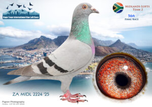 .LOT 7 CAPETOWN LOFTS – Midlands Lofts Team 2-ZA-MIDL-25-2225*** -7th Final Race Winning R10 000.00 , 5th Ace Bird Winning R7500.00——————SIRE:19 MSHS 9209.Strain: Clausing/Koopman Color: Blue Bar SIRE T O: 2x KZN Combine winners. 7th Final Cape T own Summer OLR 25/26 5T H ACE Bird Cape T own Summer 25/26.————-DAM: 20 MIDL 017 .Alias “T omohawk” Strain: Midlands Color: Blue Bar Raced 18th final Cpe T own Int OLR 2020. DAM T O: 7T H FINAL Cape T own Summer OLR 25/26. 5th ACE Bird Cape T own Summer 25/26.SEE PEDIGREE!!!!