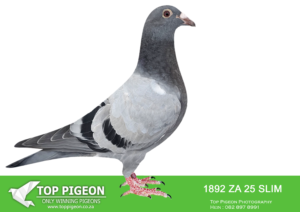 .LOT 2 CREAM OF THE CROP AUCTION 2 – 1892 ZA 25 SLIM -SIRE:ZA-2022-JB-412 Du Preez & Deetlefs Mealy Full brother of “Turbo Kittel” • 1e Ace Pigeon FCI in the World!!!! • 5x Winner in his first year. • 1e Ace Overall South Africa. • 8x Sanpo Medal Winners. • 6x Sanpo Gold Winners. • 1x Sanpo Silver Winner. • 1x Sanpo Bronze Winner. Father to 7 Winners already!! =============DAM:ZA-2022-SLIM-3333 Checkered Linebred to “18523”.SEE PEDIGREE!!!!