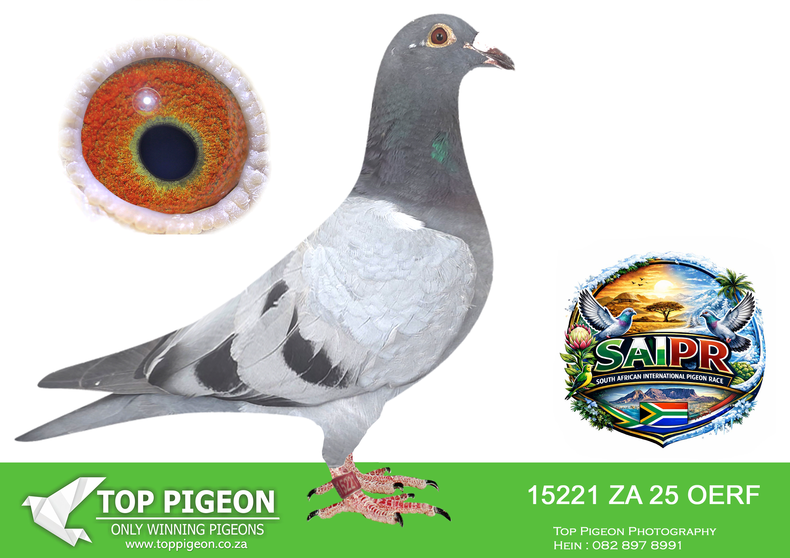 LOT 23 SAIPR SUMMER AUCTION 1 – Theuns Victor- VICTOR 108 2025 -4TH FINAL WINNING R90 000.00——-SIRE:483 ZA 19 OOA .Alias “MR WOW” Strain: Tom Lock/Sablon Color: Blue Bar SUPER RACER 8 WEEKS IN A ROW FOR OOA LOFTS!! 7th Club, 18th VPU, Glen, Y/B, 286km, 1369mpm – 1993 pigeons 11th Club, 47th VPU, Tom’s Place, Y/B, 323km, 1416mpm – 2113 pigeons 49th Club, 152nd VPU, Springfontein, Y/B, 424km, 1014mpm————DAM:6493 ZA 21 KUR.Strain: Sablon/Tom Lock Color: Blue Bar.SEE PEDIGREE!!!!