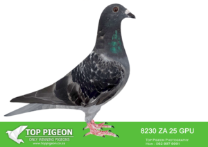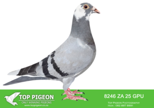 LOT 12 SURPRISE AUCTION – ZA 23 GPU 2348 -SIRE:5584 ZA 20 NKHP.Alias “LUCKY BLUE JBM’s GIRL” Strain: Danie Scholtz Color: Blue Bar Bred for Stock from our best Sablon’s. Super full Brother x Sister mating. Sire, LUCKY BLUE direct son to Superbreeder 810 x 8855. Mother, JBM’S GIRL direct daughter to Superbreeder 810 x 8855. JBM’S GIRL were sold for R86 000 on TOPPIGEON.———–DAM: 7963 ZA 22 HPT .Alias “APPLESTAR 10150” Strain: Danie Scholtz Color: Blue Bar ZA HPT 7963 ’22 bred from our best Tom Lock’s. Sire, ZA 10150 ’16 bred HOPE, 18th place, Hotspot 2, Central Provincial Lofts 2020, 320km, vel. 1330 m/min. ZA 10150 ’16 bred VICTORIA Winner of Nineth Race Penultimate at Diaz One Loft 2021, 197km, vel. 1455 m/min. VICTORIA’S nestmate sister STORMKIND, dam to ZA SANPO 13142 ’22 JEANNIE final equal winner Dinokeng One Loft Race 2023 for Gerber & Koutsoudis.SEE PEDIGREE!!!