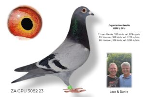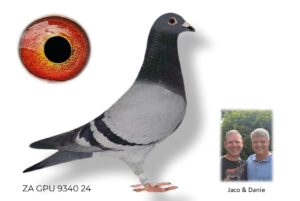 LOT 15 SURPRISE AUCTION – ZA 24 GPU 9340 –SIRE: ZA 19 GPU 13079 -SUPER BREEDER FOR J FAUL – DJ SCHOLTZ. 1 ST YEAR IN STOCK LOFT BRED WINNER AND ANOTHER SUPER RACER FLYING 2,2,12,12,23 IN BCRPC.————–DAM:2526 ZA 18 WRPD.Alias “BEST BIRD WRPD” Strain: Jaco Faul Best Bird WRPD. Very good breeder for J Faul & DJ Scholtz!SEE PEDIGREE!!!!
