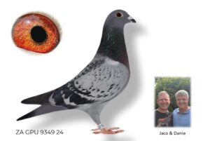 LOT 23 SURPRISE AUCTION – ZA 24 GPU 9037 -SIRE:7993 ZA 22 HPT. Alias “JB X HG LAST SON” Strain: Danie Scholtz Color: Blue Bar ZA HPT 7993 ’22 “JB X HG LAST SON” full Brother to DREAM, who bred ZA BPF/D 0694 ’18 LINDIE equal final winner Sonskyn OLR 2019, 663km vel. 1186, 50th Ace Bird. DREAM bred ZA HPT 3523 ’19 CARLADA equal winner hotspot 3, Victoria Falls World Challenge Pigeon Race 2020, winning $4000. DREAM bred ZA NKHP 5655 ’20 VICTORIA winner of Ninth Race Penultimate at Diaz One Loft 2021, 197km, vel. 1455 m/min. DREAM is grandmother to ZA BPF 934 ’21 MISS NAVIGATOR, Bakkie Winner.———-DAM:7963 ZA 22 HPT.Alias “APPLESTAR 10150” Strain: Danie Scholtz Color: Blue Bar ZA HPT 7963 ’22 bred from our best Tom Lock’s. Sire, ZA 10150 ’16 bred HOPE, 18th place, Hotspot 2, Central Provincial Lofts 2020, 320km, vel. 1330 m/min. ZA 10150 ’16 bred VICTORIA Winner of Nineth Race Penultimate at Diaz One Loft 2021, 197km, vel. 1455 m/min. VICTORIA’S nestmate sister STORMKIND, dam to ZA SANPO 13142 ’22 JEANNIE final equal winner Dinokeng One Loft Race 2023 for Gerber & Koutsoudis.SEE PEDIGREE!!!