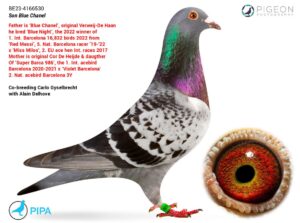 .LOT 1 SURPRISE AUCTION – BE 23 4166530 – Halfbr. 1°int. Barcelona 22———-SIRE:NL 17-1130005 M Blue Chanel Dr.Delhove Alain Verweij-de Haan.FATHER TO 1ST INTERNATIONAL BARCELONA 2022.———–DAM:NL 21-2149269 V de Heijde Cor Dr. Delhove Alain.SIRE IS 15-3515986 M Super Barca 986 de Heijde Cor 17 nat. Barcelona 4477p. 8 nat. Barcelona 4920p. 1°int. ace Barcelona.SEE PEDIGREE!!!