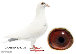.LOT 6 CORRIE NAUDE 2 – ZA 24 EDEN 1953 -SIRE:105601 ZA 18.Houben-Clausing This bird was bred out of my top Houben-Clausings. Babies bred out of him have already bred winners. This is the best of the best.————-DAM:7608 ZA TRPF 20 Inbred Houben-Clausin MIEL Inbred Houben-Clausing This is an inbred Houben-Clausing. I bred this bird and kept it. She has excellent winning blood in her. She bred winners as well. She also bred 3rd place ERPF federation winner from Riviersonderend (192 km).SEE PEDIGREE!!!!