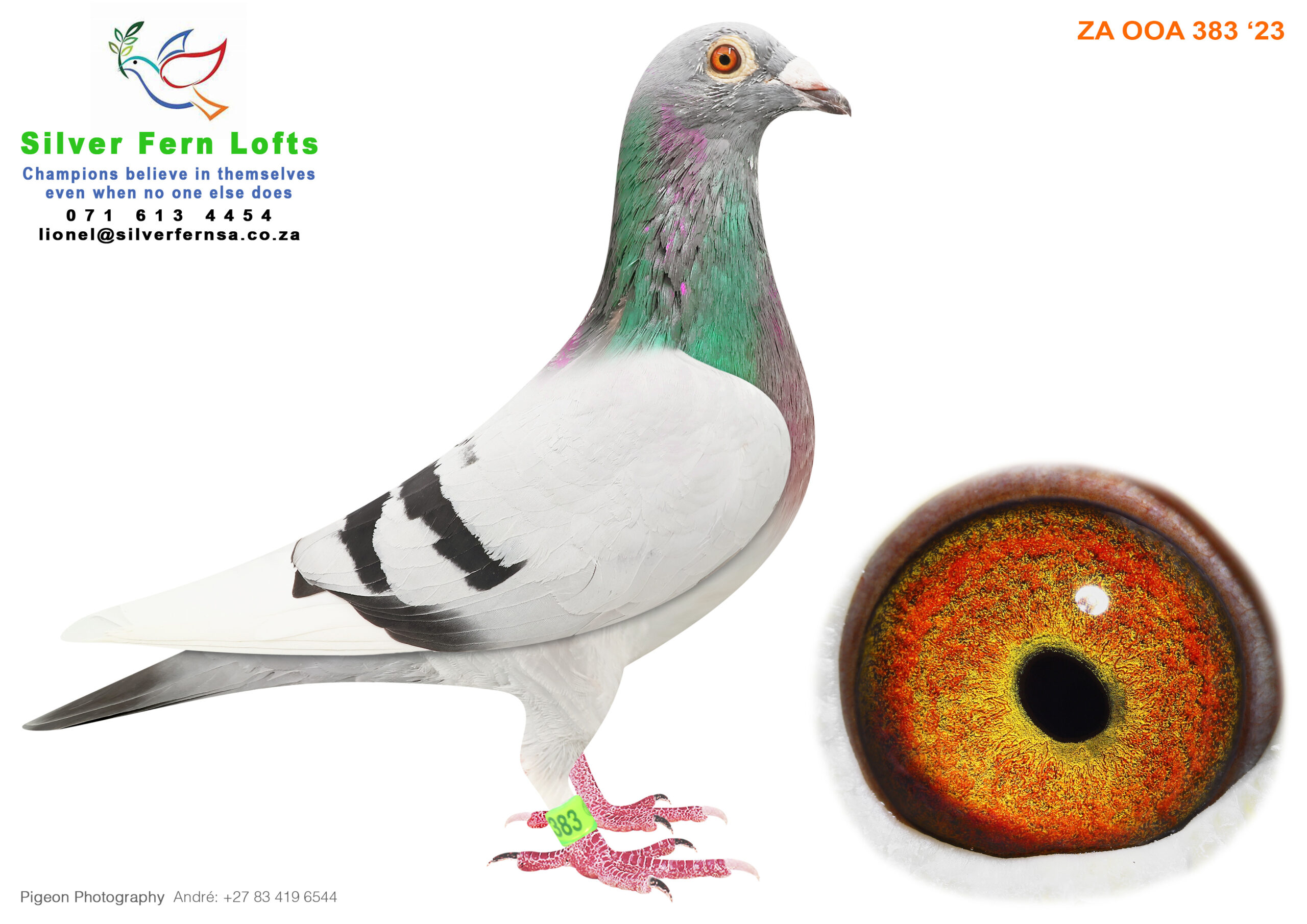 LOT 18 MASTERS AUCTION – ZA 23 OOA 383 -SIRE:5710 ZA 16 CYRILS.Alias “2nd X2nd Klapmuts 15/16” Strain: 810 BAK 17 X VAN RHYN CLO Color: Bluebar W/f Great stock cock. Full brother to ZA GPU 04887/16 – Granddam to 1st Ace & 12th CPL Bloem Final, 596km, 1380 vel 2021 Nestmate brother to ZA CYRILS 5709/16 – Dam to ZA OVRF 7861/19 – 2nd Club 2nd Fed, J/O Kampioenskappe, vel 1318.———DAM:10463 ZA 16 OERF.Alias “2ND CARNIVAL WINTER FINAL” Strain: 810 BAK 17 X VAN RHYN CLO Color: BBWF ZA OERF 10463/16 – 2nd Carnival City One Loft Winter race Final 2017! 44tH Hot Spot 1, Bloemfontein, 322.238 km, vel 1203 4th HOTSPOT 6 – Winter race Springfontein, 444km, 1282..SEE PEDIGREE!!!