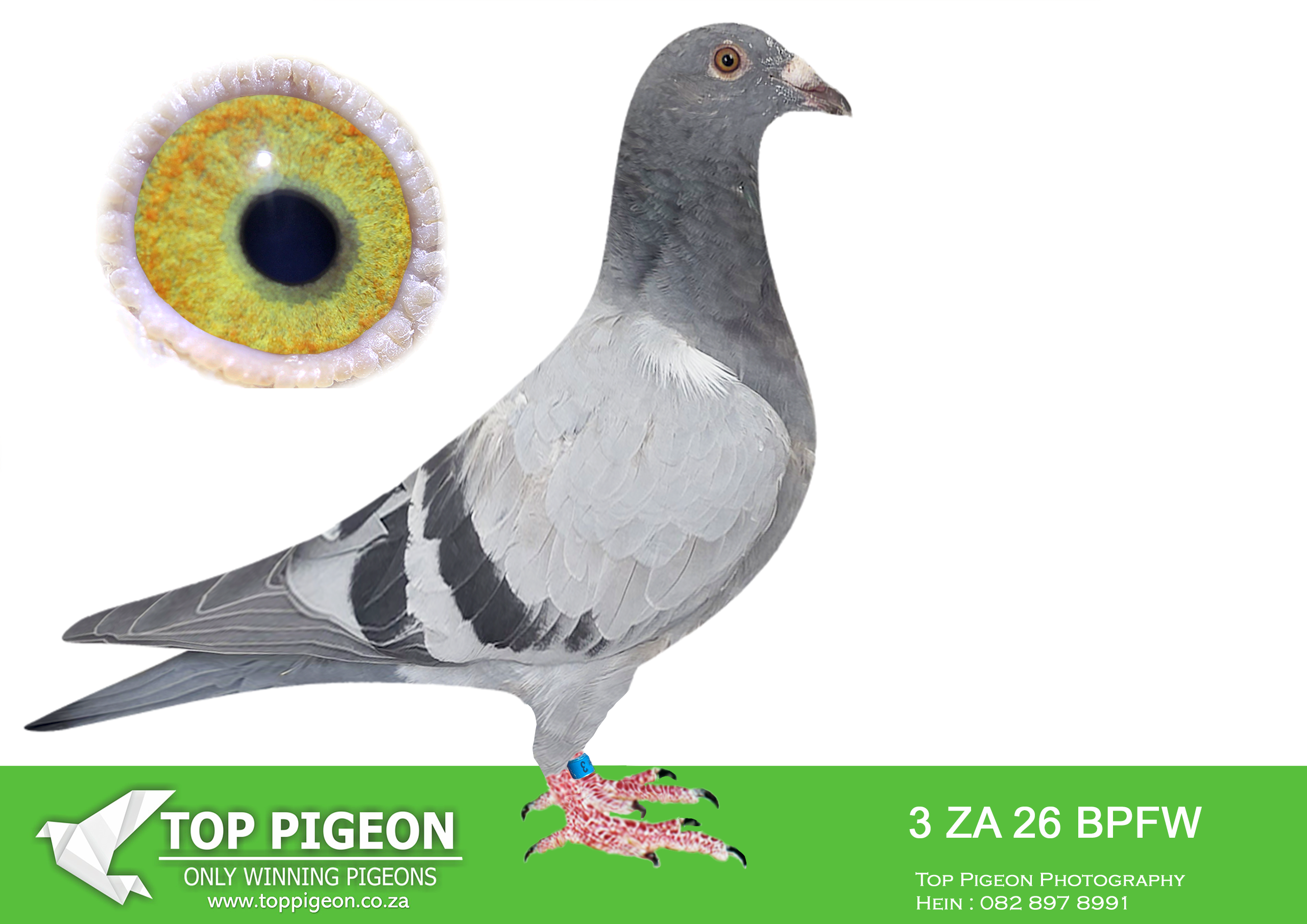 LOT 19 ANDRE ERASMUS “TSUNAMI LOFTS” – 3 BPFW 26 -ONLY TWO COCKS BRED OUT OF THIS CLICK PAIR.ONE SENT TO MARLBANK OLR, THIS ONE KEPT FOR STOCK. SISTERS ARE 4297 ZA 2024 AND 2525 BPF 2025. BOTH IN FIRST ACE BIRDS AT CPL OLR——————SIRE: 8653 ZA VPU 22 – “Click TL Cock” A powerful Tom Lock bred cock already proving himself as a top breeder. Sire to 5th Ace CPL YB 2023 Same pigeon also 7th Super Ace CPL 2023 Sire to 6th Ace YB CPL 2024 His best click is with SANPO 22470/22 The sire line traces back to the famous “Super R80 Cock” (05485 ZA GPU 17) — a direct son of the R80 000 Foundation Cock line, responsible for numerous winners and 12× SANPO Gold medal influences in the pedigree. This family is renowned for producing top racers in Union competition and One Loft Races.————–DAM: 22470 SANPO 22 – “70” An outstanding Sablon-based hen already proving herself as a producer. Dam to 5th Ace Bird Yearlings CPL Dam to 7th Super Ace CPL – ZA 2024-4297 Dam to 6th Ace CPL YB 2025 Her lineage includes the famous Hopetown Cock (6173 NKHPT 21) — grandsire of four Ace Birds at CPL OLR in the last three years. She is also closely connected to the 810 Sablon Collection, through 14810 ZA 15 “Fine Design”, a phenomenal breeding hen whose offspring show an 80% strike rate in major OLR competitions.SEE PEDIGREE!!!!