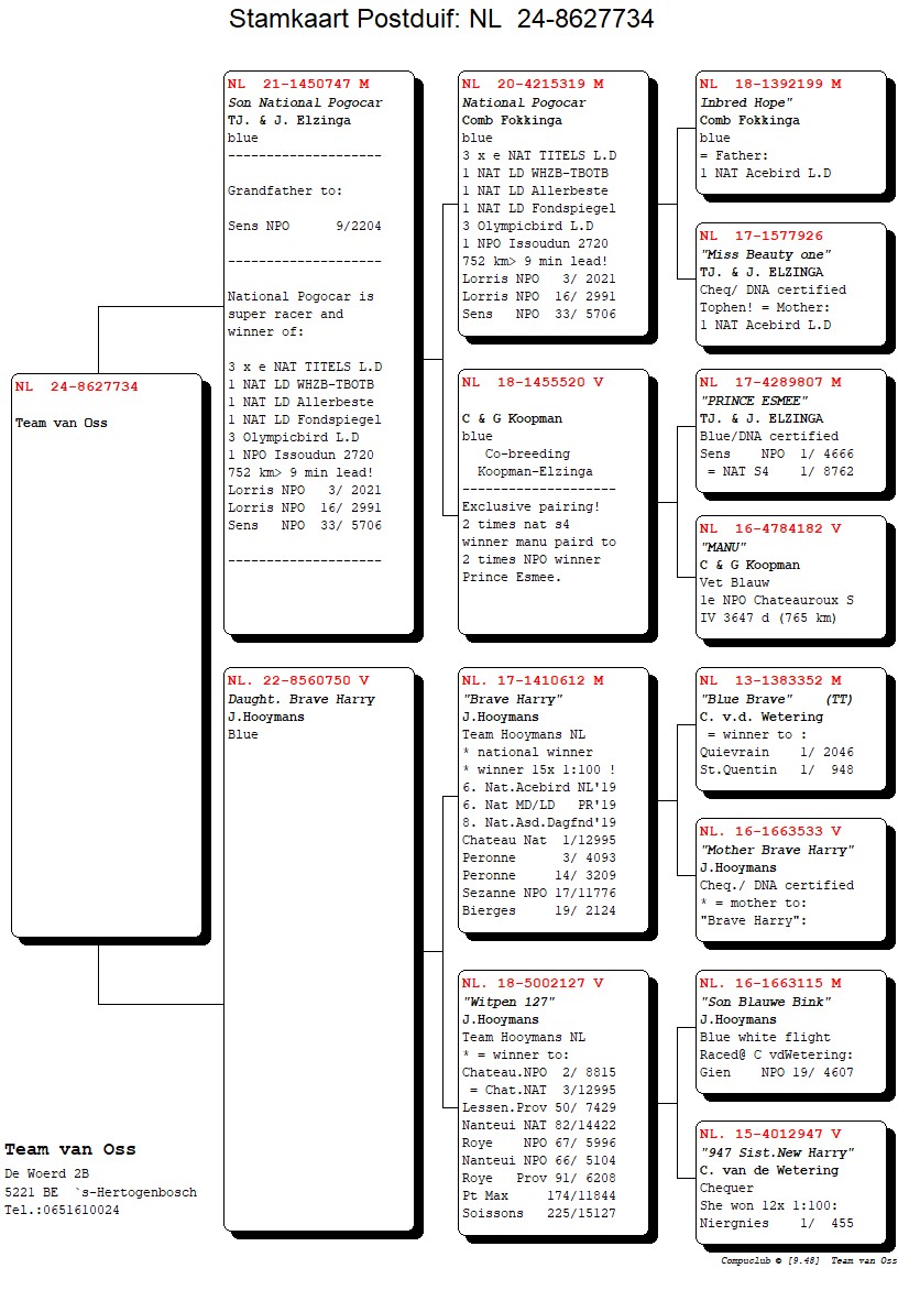 .LOT 9 AFRIKAPRO AUCTION 2 – Team Van Der Pasch – Wustmans-NL-24-8536755 -SIRE:23-9442147 No Limit 147 Jan v.d.Pasch & dht Blue Grandson “Big Ben” (Gr) father to: 9 Olympicbird young 2024 Netherlands.————DAM:NL 21-1341220 Ace Jupiter Jan v.d.Pasch & dht Hammered. 2 Acebird MD Dist 1 (250 Members) 2022. 22 Acebird MD NPO 22. 40 Acebird Yearling. The allerbeste 2022. 45Acebird PIPA MD 22. 3 Sens Dis 1.830p. 5 NPO 413km 11.864p.SEE PEDIGREE!!!