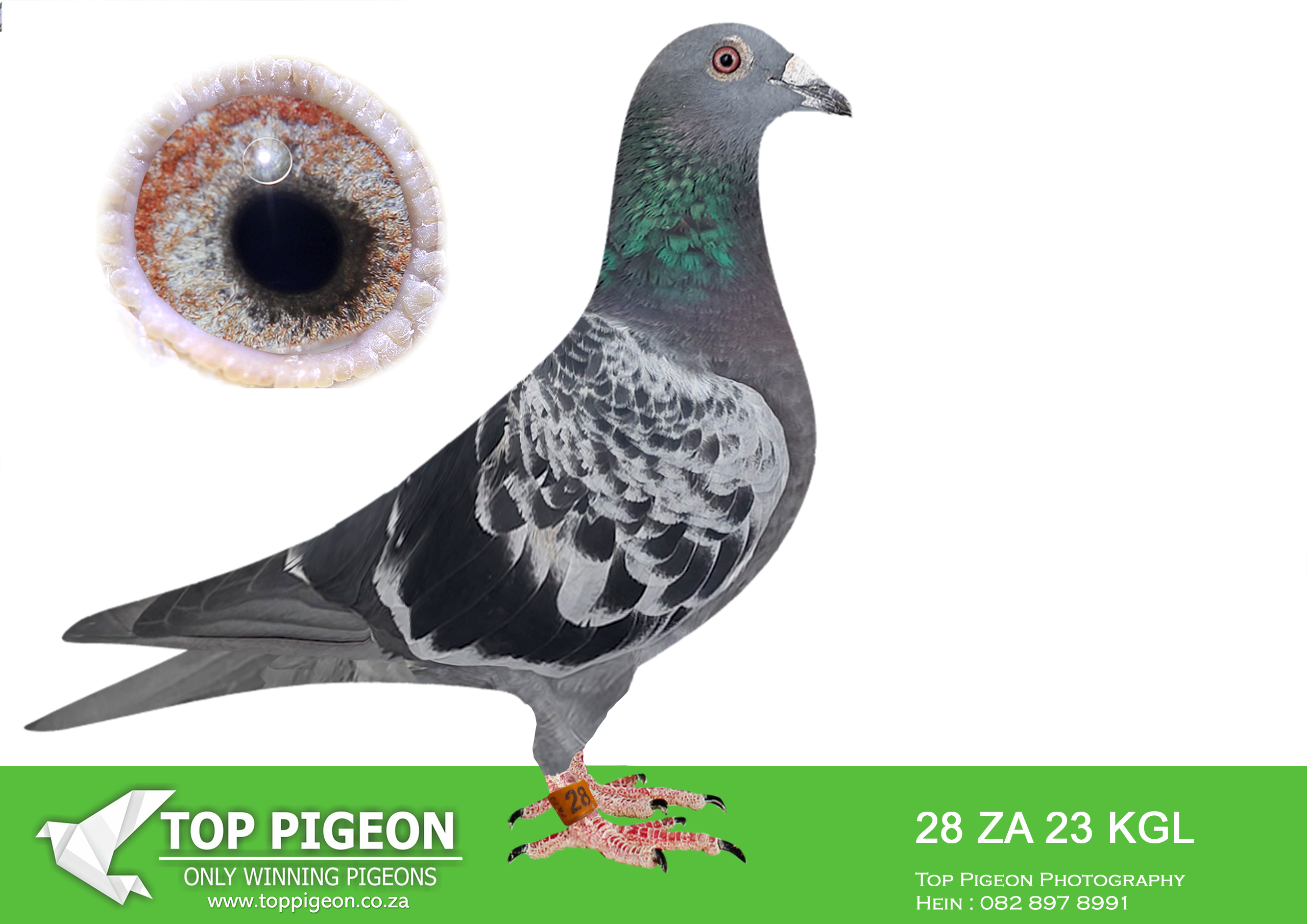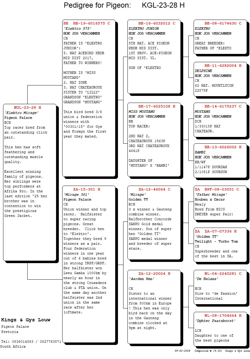 .LOT 2 EXCLUSIVE AUCTION – ZA 23 KGL 28 -Top racer bred from an outstanding click pair.This hen has soft feathering and outstanding muscle. quality.Excellent winning family of pigeons. Her siblings were top performers at Afrika Pro. In the last edition ’25 her brother was in contention to win the prestigious Green Jacket.—————-SIRE:BE-19-6016575 C ‘Elektro 575’ HOK JOS VERCAMMEN.FATHER IS ‘ELEKTRO JUNIOR’: 5. NAT ACEBIRD KBDB MID DIST 2017, FATHER TO WINNERS!MOTHER IS ‘MISS MUSTANG’ 2. NAT ZONE 3. NAT CHATEAUROUX SISTER TO ‘LILLY’ GRANDSON ELEKTRO’————-DAM:ZA-15-301 H ‘Mirage 301’ Pigeon Palace. Union winner and top racer. Halfsister to super racing pigeons. Great breeder. Click hen to ‘Elektro’. Together they bred 9 winners as a pair. Four federation winners in one year out of 6 babies bred in strong TRPF/GRPF. Her halfsister won Leeu Gamka 1000km by nearly an hour in the strong Crusaders club & PTA union. On the same day another. halfsister was 2nd union in the same race after her loftmate.SEE PEDIGREE!!!!
