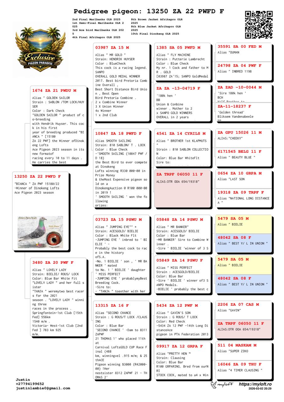 .LOT 1 EXCLUSIVE PIGEON PARADISE – ZA 22 PWFD 13250 – “SISTER BIANCA” -Her full sister “BIANCA” (15180 ZA ’22 PWF) Crowned as Winner of the Ace Pigeon Competition at Dinokeng OLR 2023 season. Her best performances were 13th position race 6 from Colesberg 655km 1236 m/m the race with the longest hours on the wing (10 minutes short of nine hours) & 5th on the drop of 8 pigeons in the BAR ZA LONA Race from Hanover, 724 km, 1488 m/m. She won a total of R130 000 in prize money. If you study the pedigree carefully you will find 3 diferent SANPO Gold Medal Winners, but 5 times represented. Also not to mention the granddam “SMOOTH SAILING”, she needs no introduction as she is probably the best to ever compete at Dinokeng OLR.SEE PEDIGREE!!!!