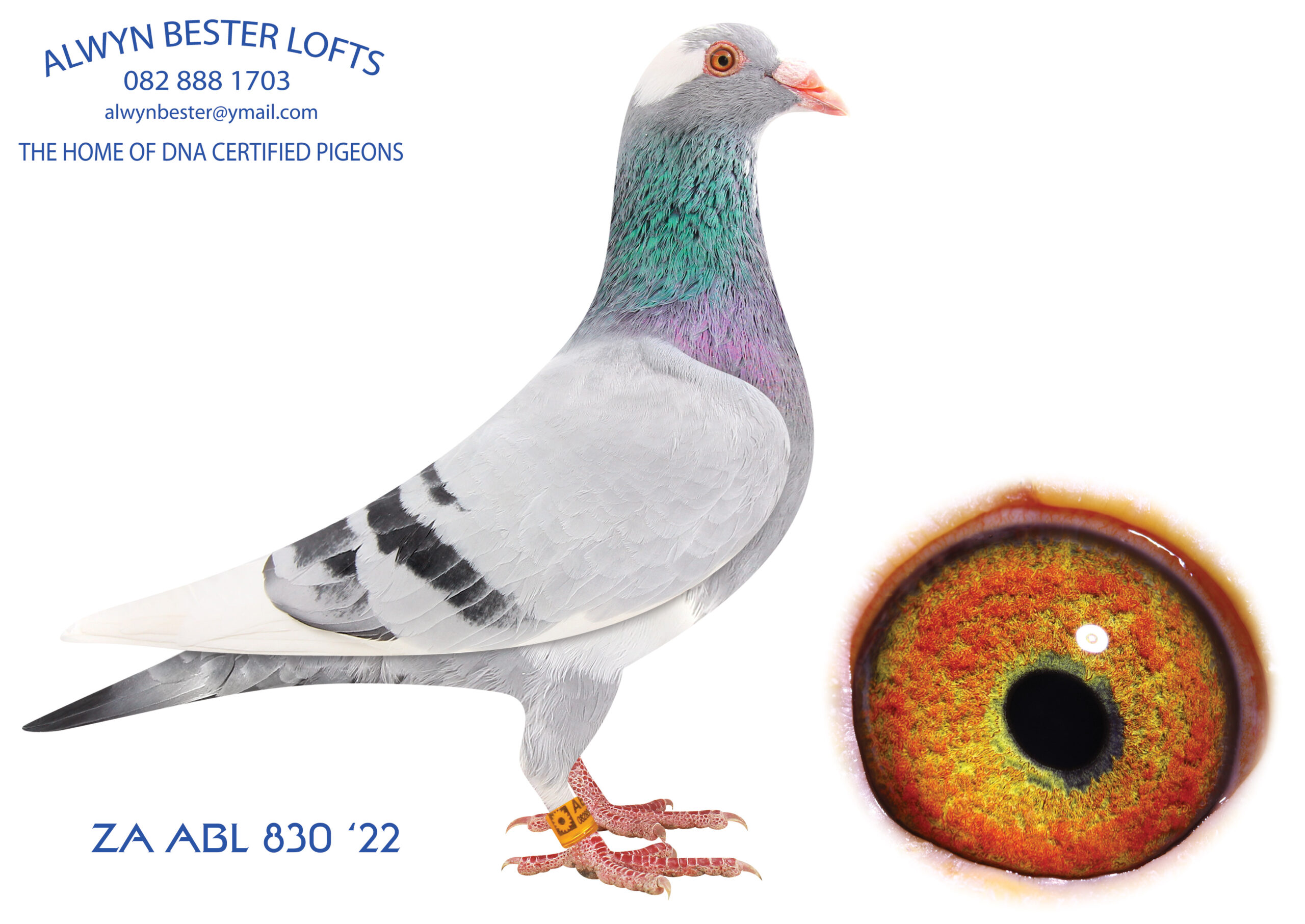 .LOT 2 GLOBAL AUCTION 2 – ZA 22 ABL 830 -Bred from full brother to Concorde mated to his half sister.————-SIRE: 02820 ZA 16. Strain: Alwyn Bester Color: Cheque Pied Full brother to 09981/13, “CONCORDE”,SANPO GOLD MEDAL OVERALL 2015. I kept this cock to replace his famous brother in the stock loft after 09981 was sold to Ferdie Lubbe. A super handling pigeon..——————DAM:9184 ZA 19 PRPC.Strain: Alwyn Bester Color: BLUE BAR PIED Full sister to GOLDEN STAR, 6th best Grand Averages DERBY ARONA 2017. Bred from Sire to CONCORDE to full sister of Concordes dam.SEE PEDIGREE!!!