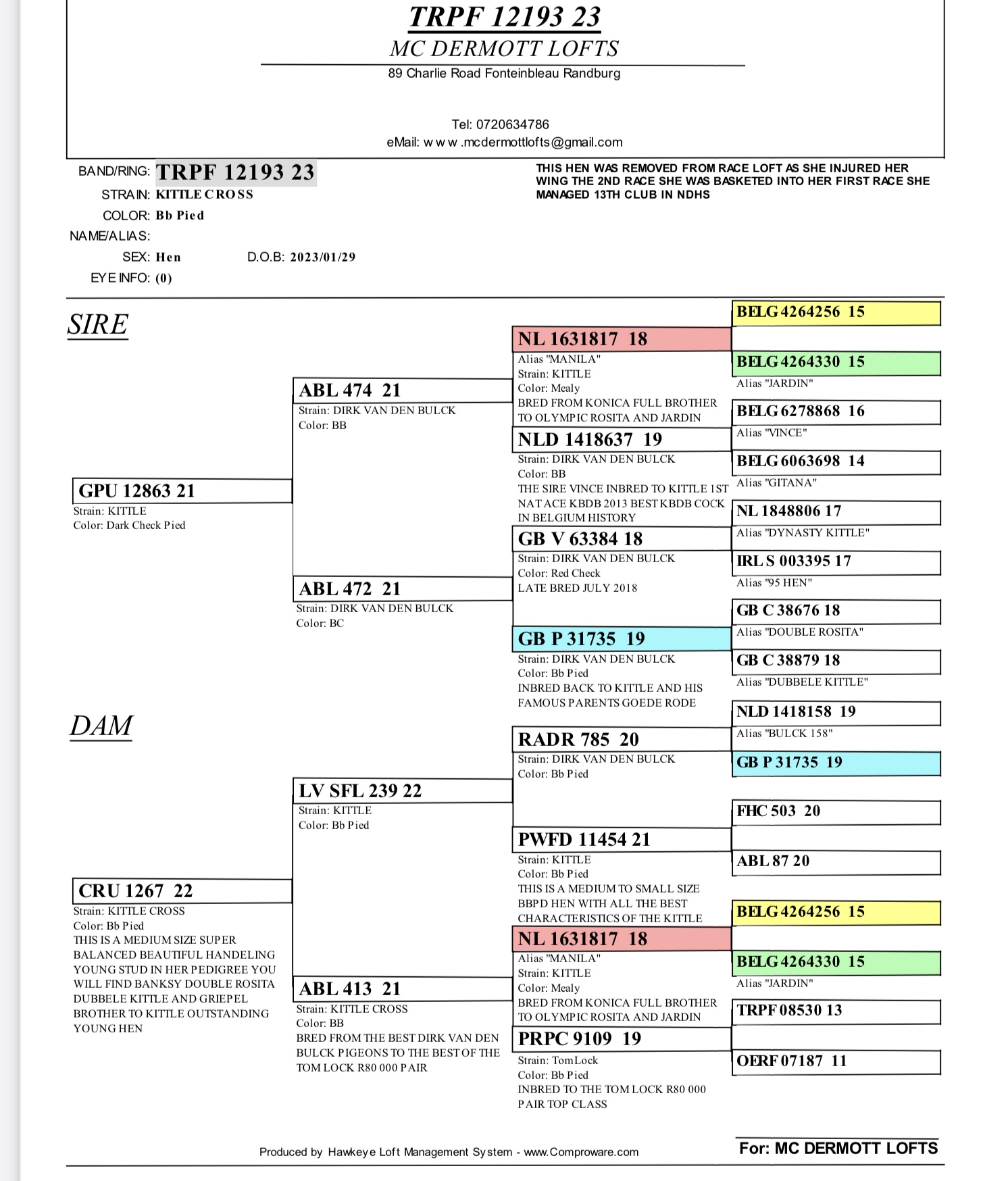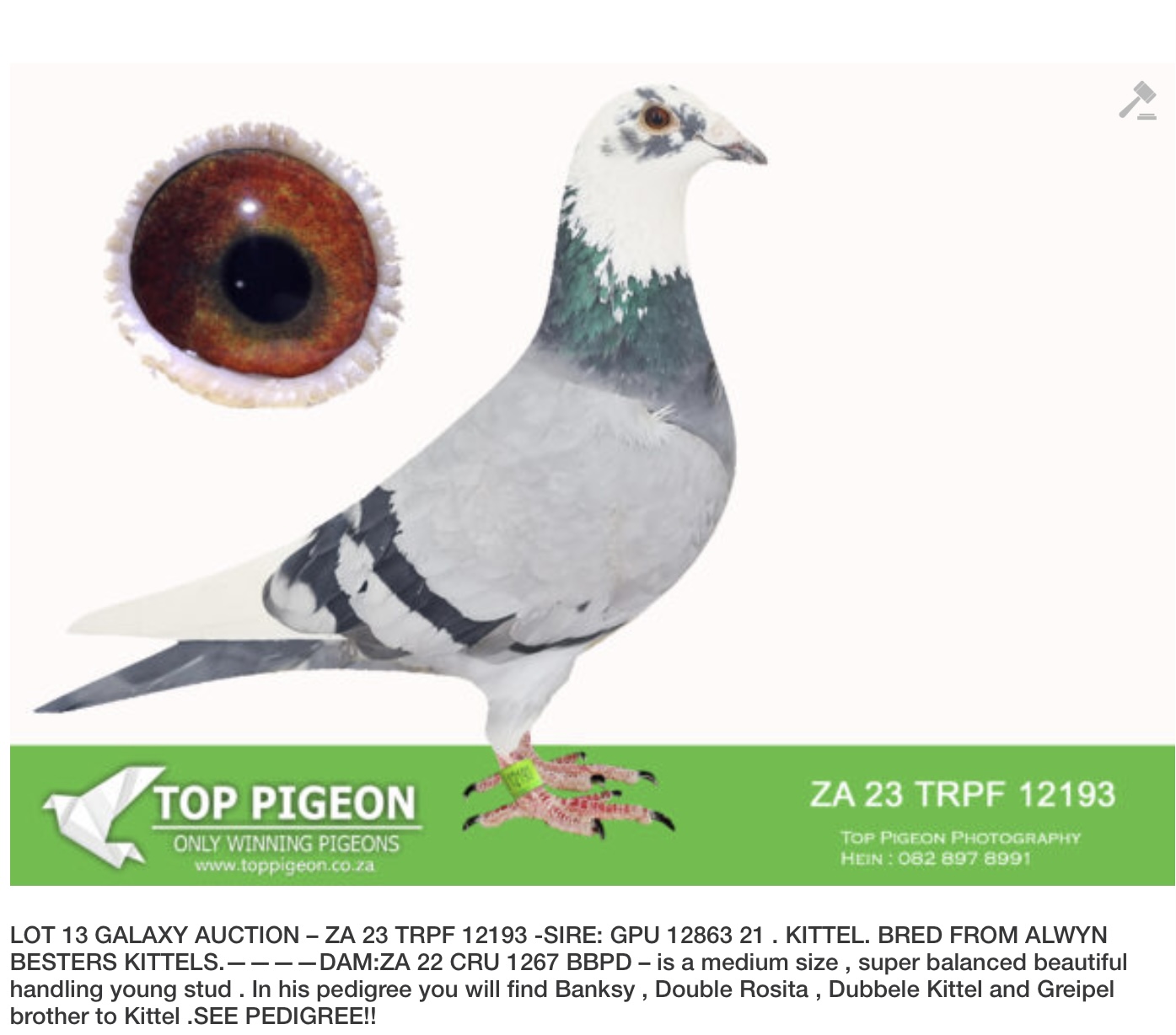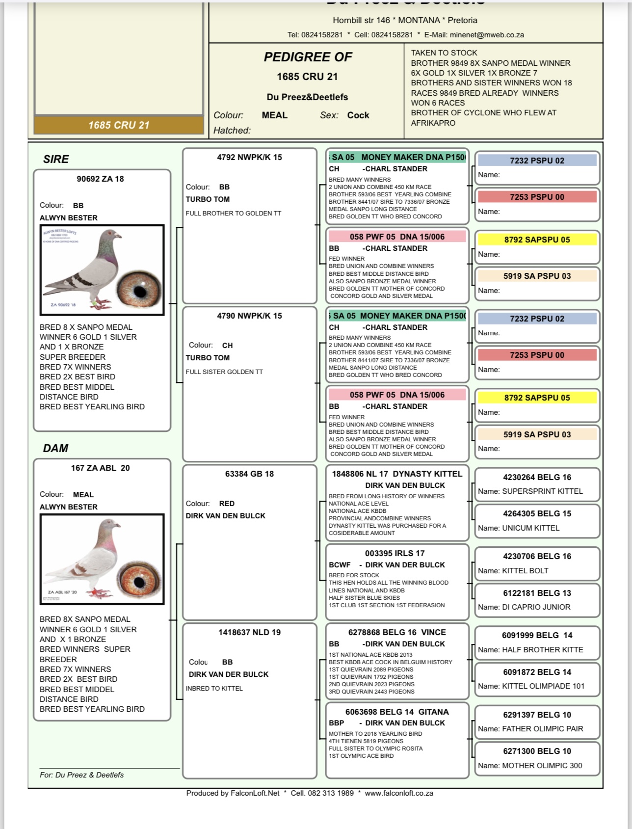 .LOT 2 MIKE ENGELBRECHT -ZA 25 ME BULLCAT 626 -SIRE:1685-CRU-21.Full Brother to 9849 “Turbo Kittel” a 8 x SANPO medal winner 6x gold 1x silver 1x bronze 7 brothers and sisters winners won 18 races 9849 bred winners of 6 races.———–DAM:TRPF 12193 23. KITTEL CROSS. DAM IS is a medium size , super balanced beautiful handling young stud . In his pedigree you will find Banksy , Double Rosita , Dubbele Kittel and Greipel brother to Kittel .SEE PEDIGREE!!