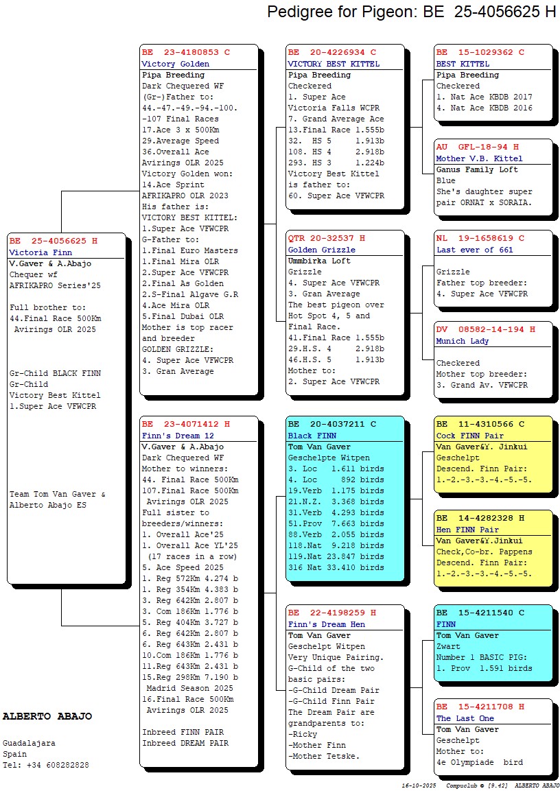 .LOT 1 AFRIKAPRO AUCTION 3 – Tom van Gaver – Alberto Abajo BE-BE-24-6196077 -SIRE:BE 24-4070622 Black Africa Finn V.Gaver&A.Abajo Dark Chequered Raced in AFRIKAPRO Series 2024.————–DAM:ZA GPU-23-3564″TEMPO”. PIGEON PALACE.uper hen at AfricaPro Series 2024, winner of: 37. Final 600 km in very hard condtions. AfrikaPro Series 2024.SEE PEDIGREE!!!!