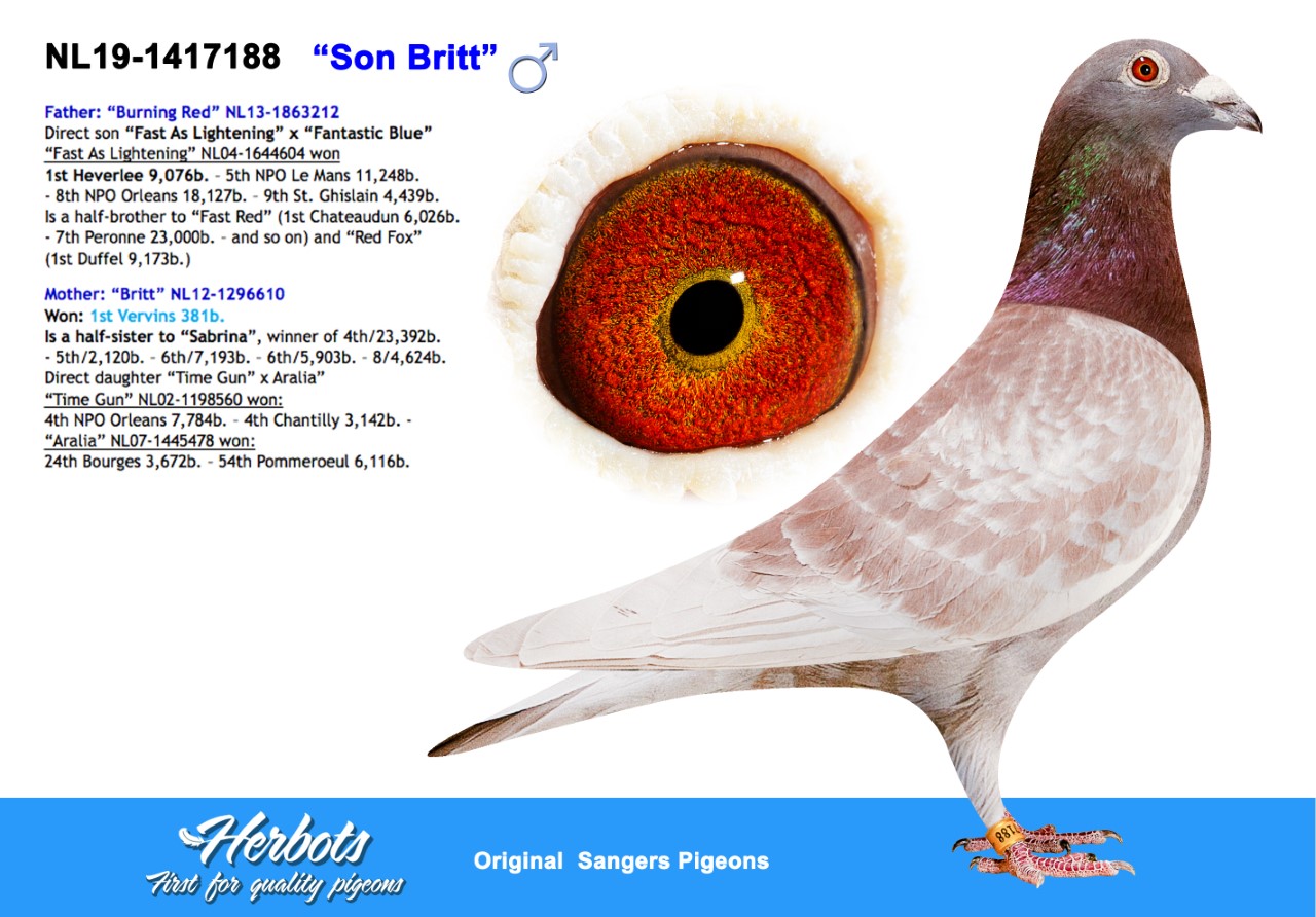 .LOT 6 GLOBAL AUCTION – BE 21 4217682 -SIRE:‘BOLD BAK 17’, FROM ‘BOLD EAGLE’ X ‘GR.G.DGHT. BAK 17’ Half-brother (same father) to ‘711/17’. 2. Ace Pipa Ranking over 5 long distance races 2020. 3.Ace Pipa Ranking over 9 long distance races ( 2019-2021 ). 4.Ace Pipa Ranking over 8 long distance races ( 2019-2021 ). 5.Ace Pipa Ranking over 7 long distance races ( 2019-2021 ). 5.Ace Pipa Ranking over 6 long distance races ( 2020-2021 ). 6.Ace Pipa Ranking over 5 long distance races ( 2020-2021 ).———–DAM:‘HS BOLD EAGLE 189’, FROM FATH. ‘BOLD EAGLE’ X DGHT ‘EAGLE EYE’. Winner of 76. prov. Orleans – 1,329 birds 2018. 223. Prov. Chateauroux – 4,708 birds 2018. 295. Prov. Chateauroux – 5,209 birds / 1734. Nat. – 27,081 birds 2018. Nestmate to ‘Miss Orleans’ 190/17. 1. prov. Orleans YL – 853 birds 2018. 2. Toury – 303 birds. 3. local / 59. prov. Orleans YL – 1,329 birds 2018. 5. local / 85. prov. Bourges YL – 3,886 birds 2018.SEE PEDIGREE!!!