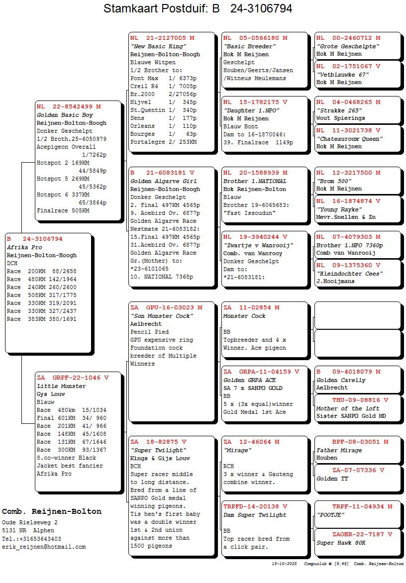 LOT 21 AFRIKAPRO AUCTION 4 – Hok Reijnen 2-BE-24-3106794 -SIRE:NL 22-8542499 M Golden Basic Boy Reijnen-Bolton-Hoogh Donker Geschelpt 1/2 Broth.25-6050979 Acepigeon Overall.————–DAM:GRPF-22-1046 V.PIGEON PALACE.DAM IS 18-82875 V “Super Twilight” Kings & Gijs Louw BCH Super racer middle to long distance. Bred from a line of SANPO Gold medal winning pigeons. Tis hen’s first baby was a double winner 1st & 2nd union against more than 1500 pigeons.SEE PEDIGREE!!!!