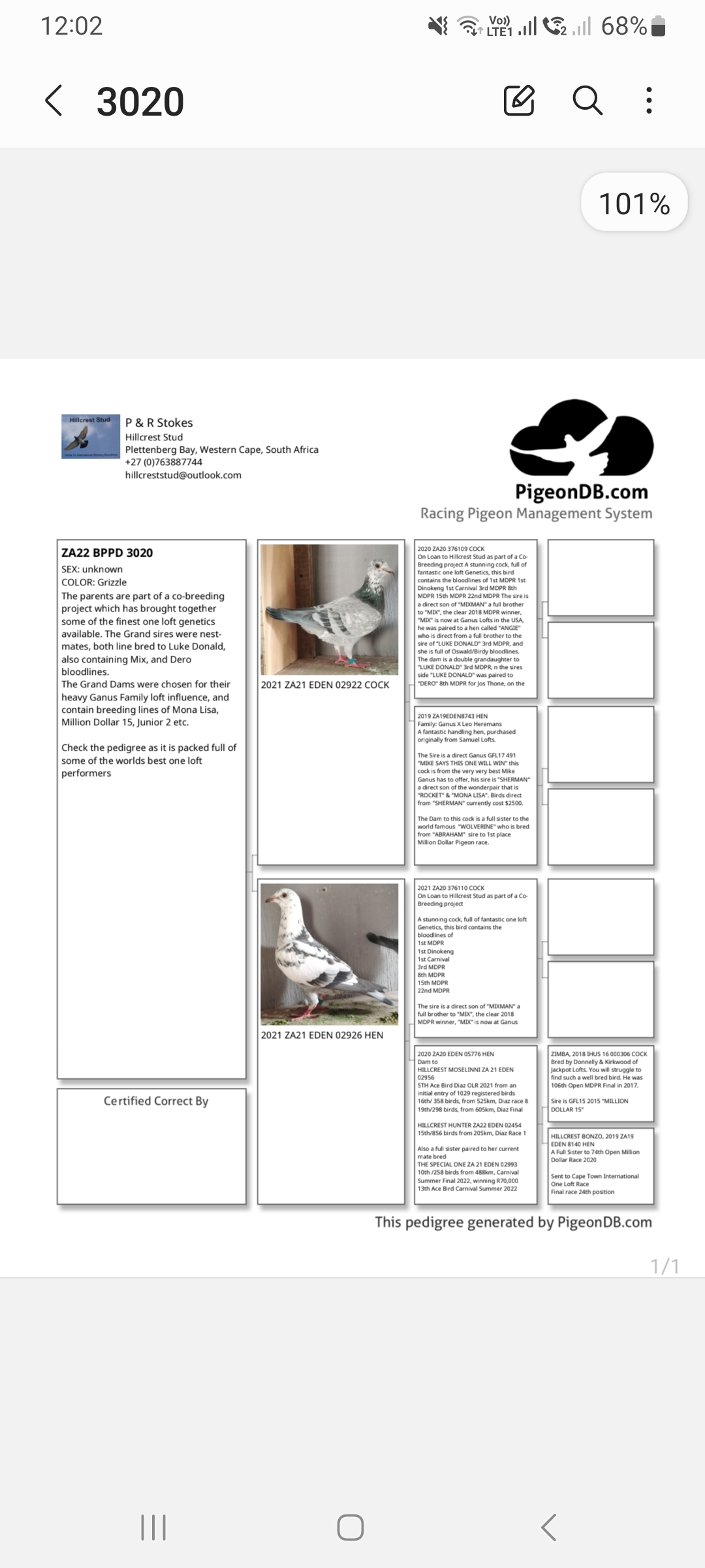 LOT 17 ANDRE ERASMUS “TSUNAMI LOFTS” – 2542 ZA BPF 24 -ONE OF ONLY TWO DAUGHTERS OF “HENNIE” , DIRECT SON OF HOTSHOT WHEN MATED TO HIS FULL SISTER.HENNIE MATED TO HIS NIECE————–Sire: 1479 ZA PWF 20 – “HENNIE” A direct son of the legendary “HOTSHOT”, one of the greatest 810 Sablon breeders in South Africa. “Hotshot” is a full brother to famous pigeons such as Fine Design, Rough Design, Pippa and Rocky, all renowned producers in the Sablon dynasty.————Dam: 4030 BPF/D 20 – “UPTOWN GIRL” A super Sablon hen and proven producer, already responsible for multiple winners and One Loft Race performers. She is a daughter of “Piano Man”, a top breeder of winners for Carel Meintjies and Dr Calitz (Postmasburg), combined with the elite Fine Design 810 Sablon line. The dam side is built around the famous 810 Sablon collection, including Boytjie and JBM’s Girl, a hen whose descendants include Dinokeng OLR Final winners and top-placed pigeons, confirming this line as one of the most successful One Loft Race families in South Africa.SEE PEDIGREE!!!!