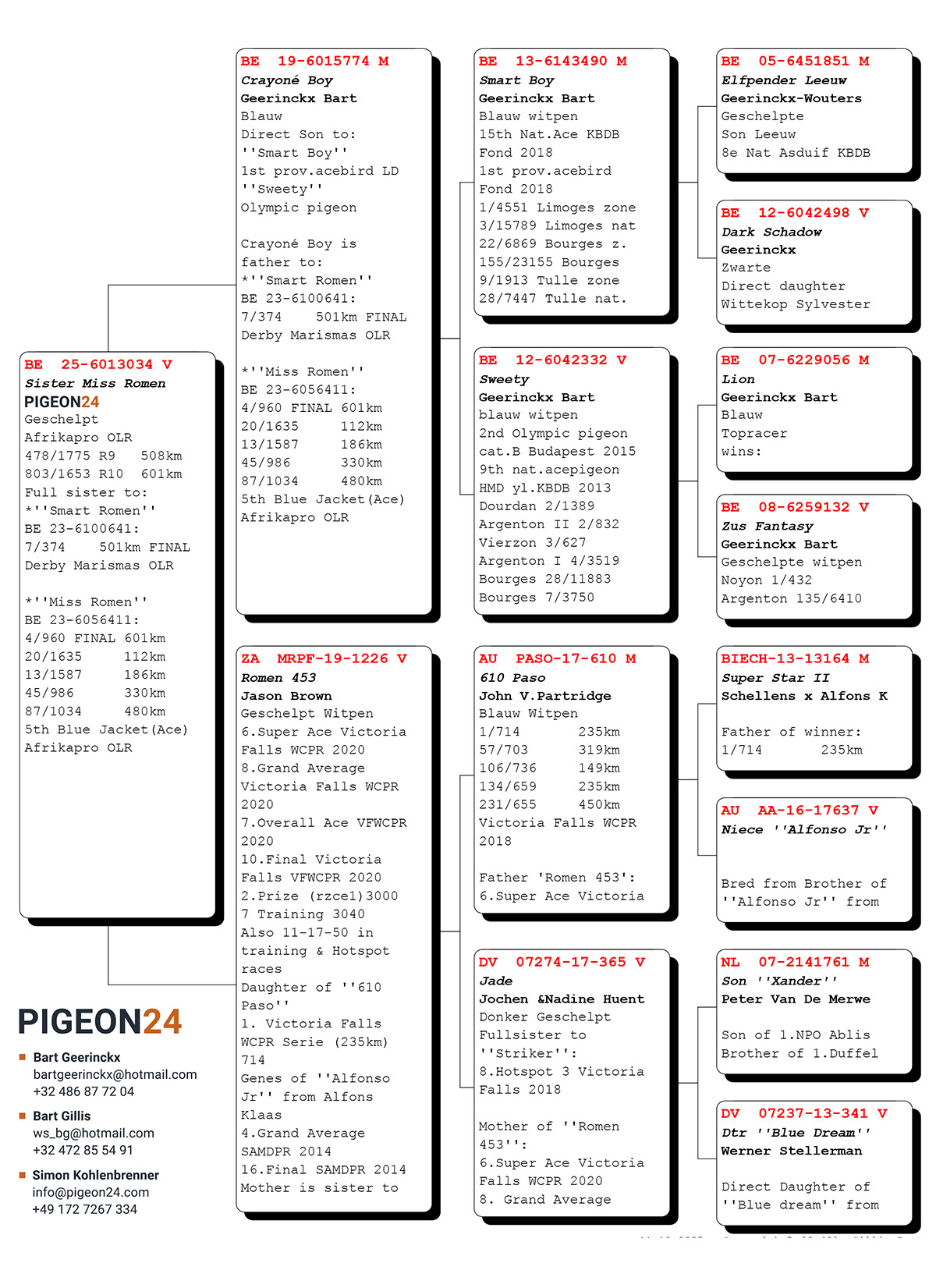 LOT 22 AFRIKAPRO AUCTION 4 – PIGEON24-BE-25-6013034 -SIRE:BE 19-6015774 M Crayoné Boy Geerinckx Bart.Direct Son to: ”Smart Boy” 1st prov.acebird LD ”Sweety” Olympic pigeon.————DAM:MRPF-19-1226 V.Jason Brown Geschelpt Witpen 6. Super Ace Victoria Falls WCPR 2020.SEE PEDIGREE!!!!