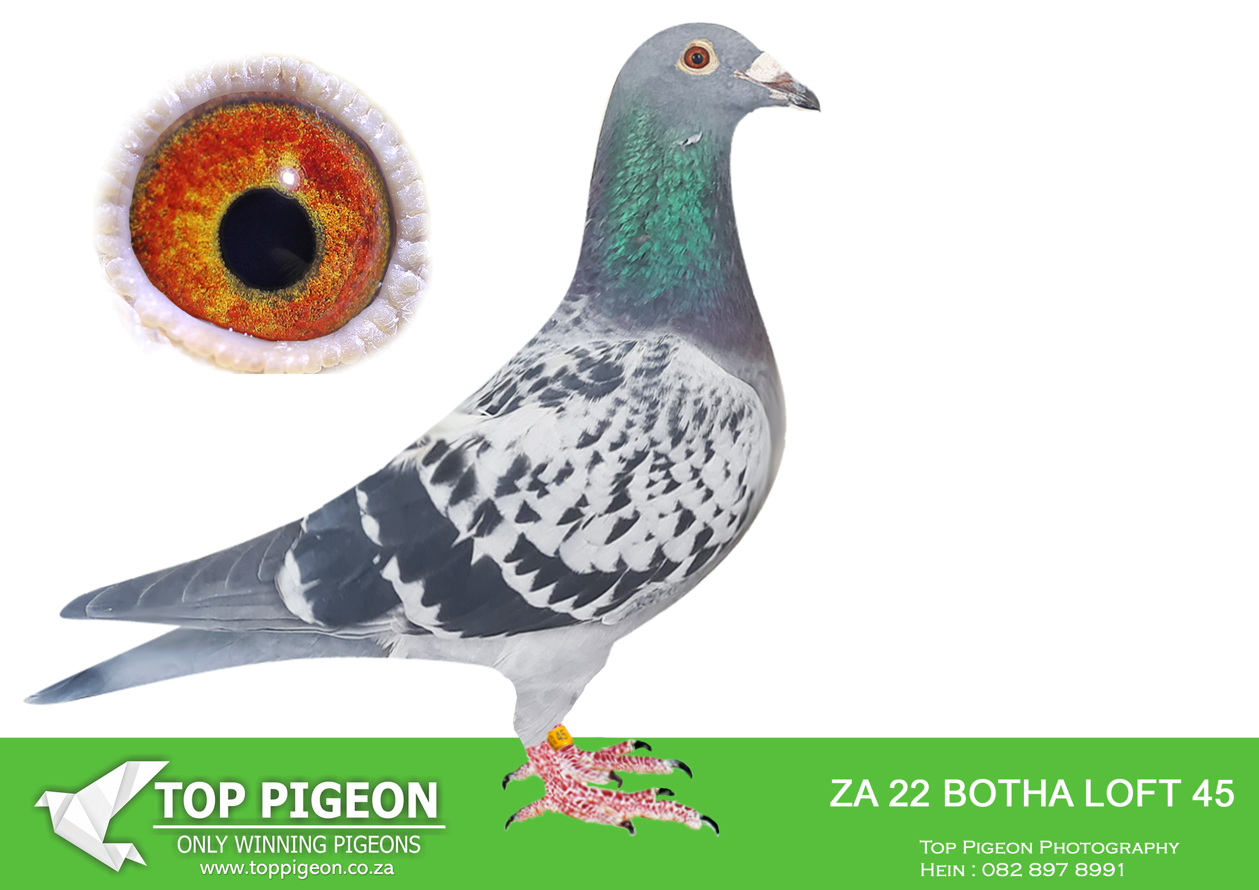 LOT 22 LEGENDS AUCTION – ZA 22 BOTHA LOFT 45 -BROKEN WING————BRED BY BOTHA LOFTS—- SIRE:8993 ZAPWDU 20. Bred from click pair, sold for R250 000. Full brother to: 08223/15; 9x top 27 PWDC; 1st 2YO, 3rd Overall; 3rd Open, 4 S/Dist bird; 11580/16; Excellent racer bred 2316/20 Cradock Union winner by 22min. 11581/16; Excellent racer bred 1313/22, Gariep Dam Union Winner. 4195/19, Verkeeerdevlei, Union winner.——DAM: 9207 ZA 20 PWDU. DIRK VAN DEN BULCK .HER SIRE IS GRANDFATHER TO TURBO KITTEL 6 X SANPO GOLD MEDAL WINNER.SEE PEDIGREE!!!