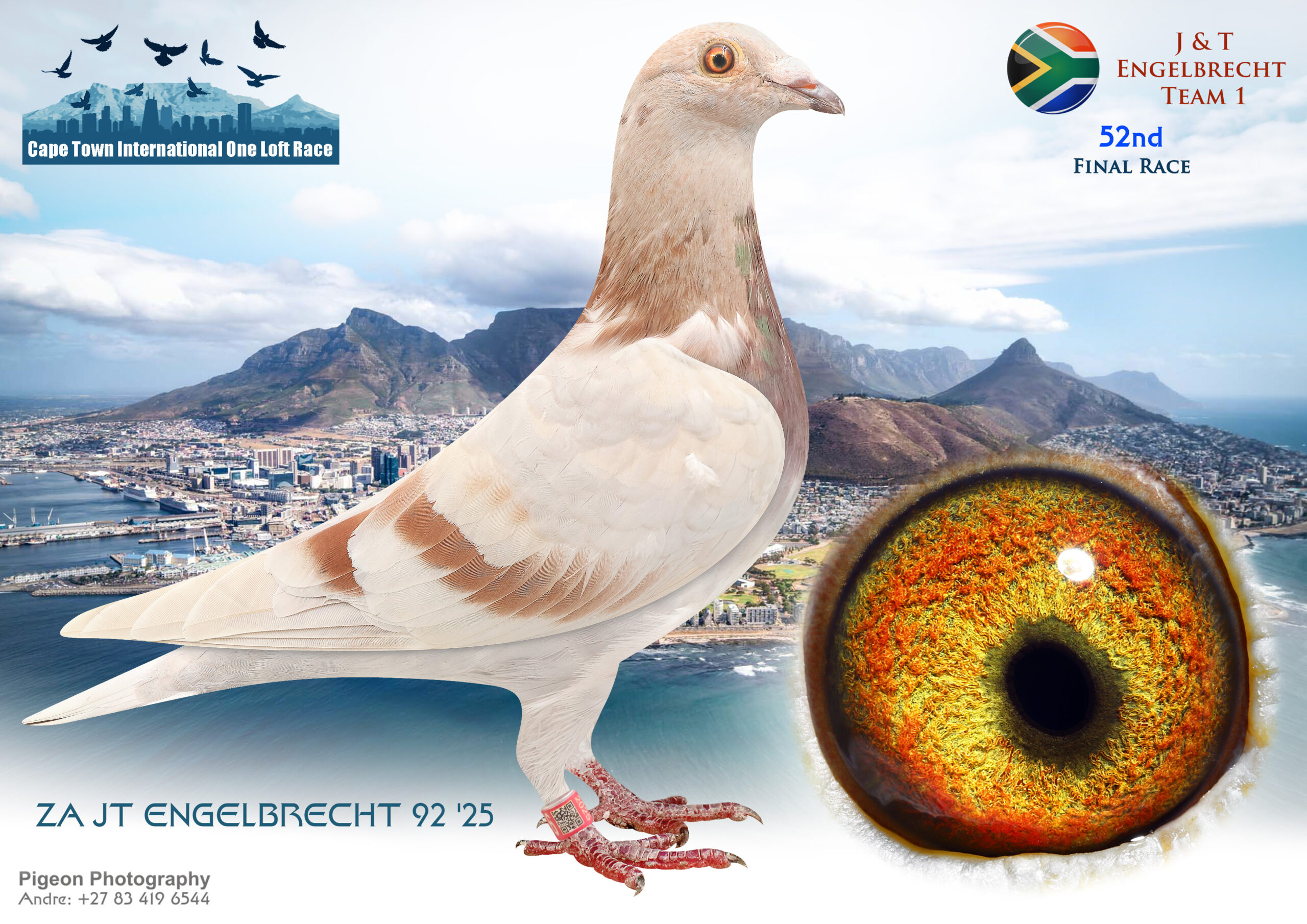 LOT 24 CAPETOWN LOFTS – J & T Engelbrecht Team 1-ZA-JT ENGELBRECHT-25-92*** -3RD HOTSPOT 1 —–HIS/HER BROTHER WON FINAL RACE 2025 OVER 601 KM AT CTIOLR, WINTER—–SIRE:52 JT ENGELBRECHT 24. “JOKER BEST KITTEL 24”. Engelbrecht: Forbes/Best Kittel/Shakira Mating Brother to Sister, both who already proved their value to breed EXCELLENT RACERS, LIKE WINNER 304 km DINOKENG, WHO BRED 4 TH ENDURO ACE AFRIKAPRO ’24, + HIS MOM BRED 31 ST ACE PIGEON AFRIKAPRO ’23..—————–DAM:41 JT ENGELBRECHT 24 BBAR Engelbrecht:Zander/Birdy/Rau britter/foot As Youngster of 2024, she achieved 7 th prize in Hotspot 2 over 220 km against 1301 Pigeons. Her father is a proven breeder for lower velocities. Her mother bred winners and close to winners on local and in OLR. She is a star breeder.SEE PEDIGREE!!!!