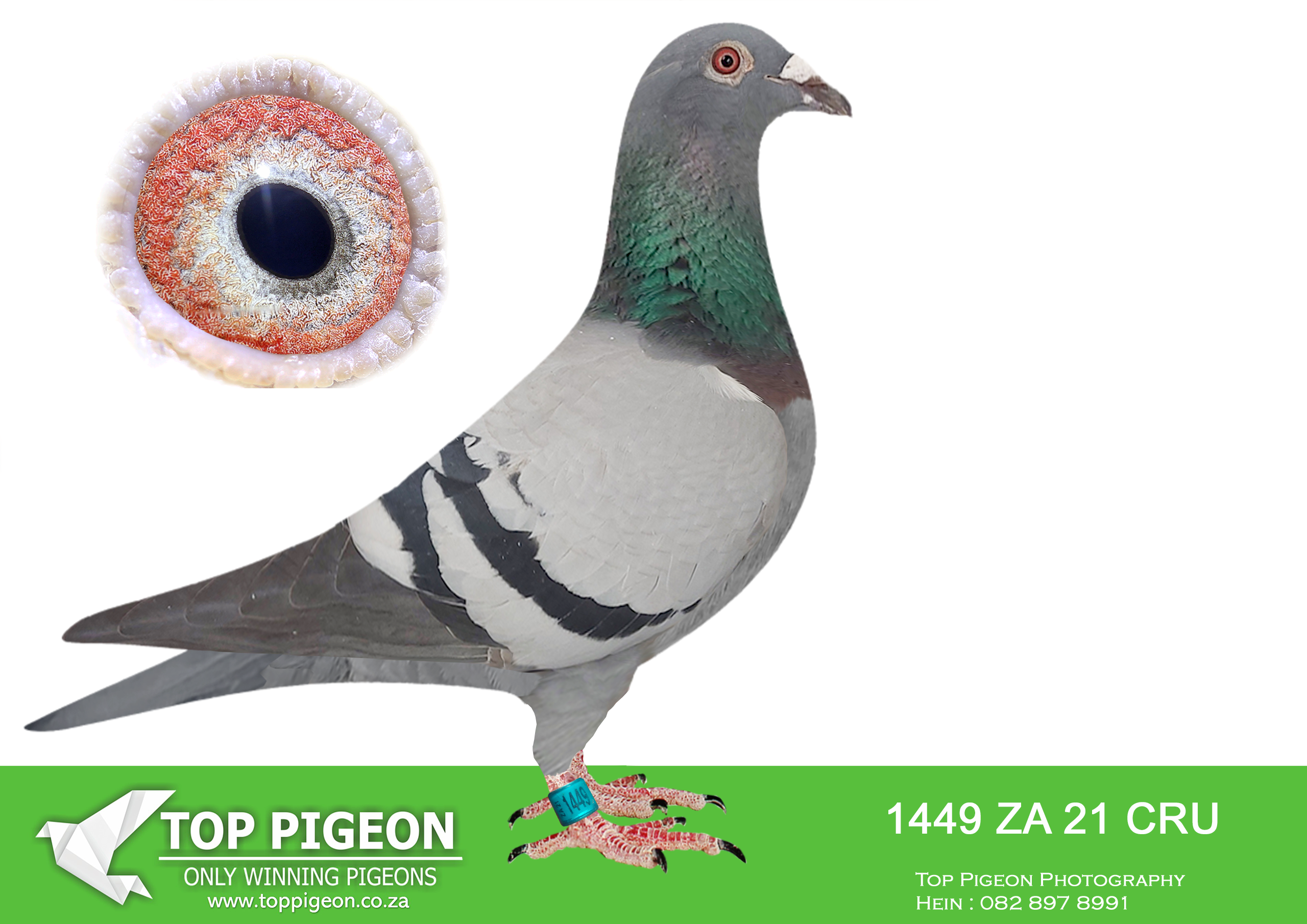 .LOT 8 LEGENDS AUCTION -ZA 22 CRU 186 -SIRE: 82144/15 super son Moneymaker & halfbrother famous ‘Golden TT’ dam to SANPO Gold Medal ‘Concorde’ and ‘Mirage’. 82144/15 is a double winner bred from two of the best Twilights ever bred. He is a super handler and a future foundation cock. His first 2 babies won. His daughter 27557/17 was the best short distance pigeon PTA union 2019. Also 3rd best bird PTA combine all round for birds racing against 2000 plus pigeons. In only 2 seasons of breeding his babies excelled at any velocity and distances up to 700km. His son won the union this year from a very hard race 1100 mpm. This is the next ‘Moneymaker’ a cock with a great future ahead of him! Good luck to the lucky fancier buying this champion!——––DAM: ZA 19 PRPC 9654 “54 CLOWN”. TOP RACER AND SUPER HANDLER. EXCELLENT LITTLE HEN FROM OUR BEST . THIS LINE HAS PERFORMED VERY WELL AT AFRIKAPRO 2022 AND AT OUR OWN LOFT.SEE PEDIGREE!!!