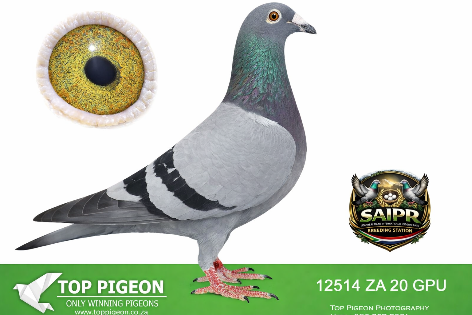 LOT 32 SAIPR BREEDING STATION – 974 ZA 20 GJT -17TH ACE BIRD CAPETOWN IOLR 2021———-SIRE: “CARELLI’S BEST” (Bak 17 Line) A top-class breeding cock built from the elite Bak 17 × Carelli Sablon foundation, known for producing consistent winners. He carries the blood of proven performers like “Mr Joy” (05891 GPU 13 ZA) – a top Verbesselt-based breeder responsible for multiple race winners, including performances in Million Euro & Taiwan races. On the dam side of the sire we find “Carelli Ace Line” (05777 GPU 13 ZA), a daughter of multiple winner breeders, reinforcing the Carelli Sablon strength. This cock is tightly bred to a powerful combination of De Rauw Sablon, Aelbrecht, and Bak 17, with influence from “Lucky Freddy” and “Marcelina”, both known for producing OLR super racers and high-performing progeny.————DAM: Direct KAASBOER Dynasty (Nr 1 Hen Line) An exceptional hen bred from the very best Kaasboer blood in South Africa, directly linked to the legendary “Gold Gouda P1600189” and “Kiran P1600177”. “Gold Gouda” – Nr 1 Kaasboer cock in SA, sire to a 7x winner, 3rd SAPIR, and multiple top performers. “Kiran” – Nr 1 Kaasboer hen in SA, dam of 7-time winners, SAPIR performers, and several proven breeders. This hen originates from the famous MC Hansen Kaasboer stud (Denmark), combining “Koe Oog” and “Bon Duivin”, two of the most influential Kaasboer pigeons ever imported. 👉 A powerhouse dam line known for consistency, durability, and top-level winning ability across generations.SEE PEDIGREE!!!