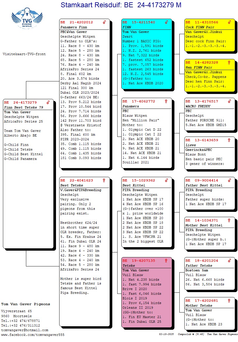 .LOT 9 AFRIKAPRO AUCTION 2 – Team Van Der Pasch – Wustmans-NL-24-8536755 -SIRE:23-9442147 No Limit 147 Jan v.d.Pasch & dht Blue Grandson “Big Ben” (Gr) father to: 9 Olympicbird young 2024 Netherlands.————DAM:NL 21-1341220 Ace Jupiter Jan v.d.Pasch & dht Hammered. 2 Acebird MD Dist 1 (250 Members) 2022. 22 Acebird MD NPO 22. 40 Acebird Yearling. The allerbeste 2022. 45Acebird PIPA MD 22. 3 Sens Dis 1.830p. 5 NPO 413km 11.864p.SEE PEDIGREE!!!