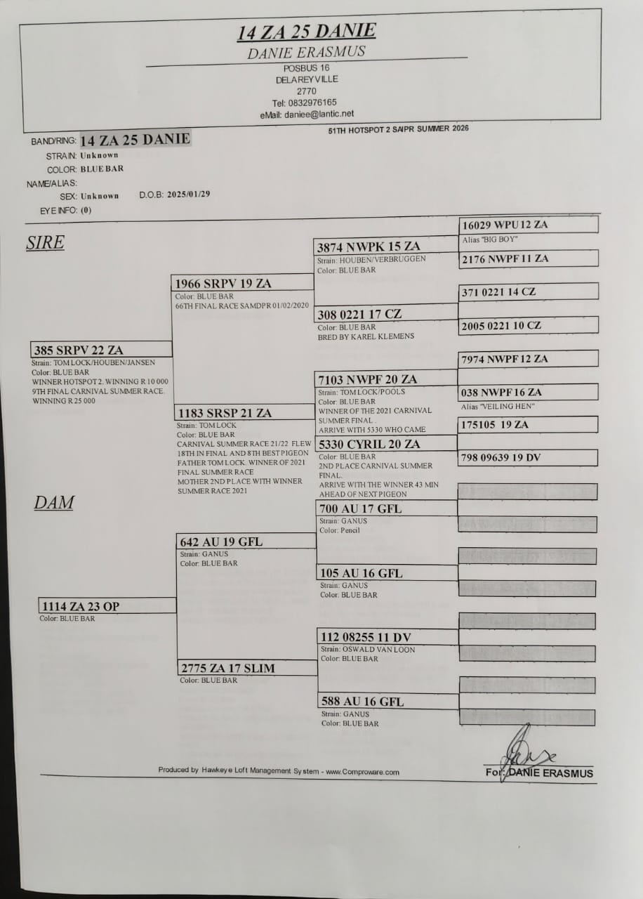 LOT 15 SAIPR SUMMER AUCTION 3 – BENEKE LOFTS / KDK RACING-TOPPIGEON 5 2025 –
