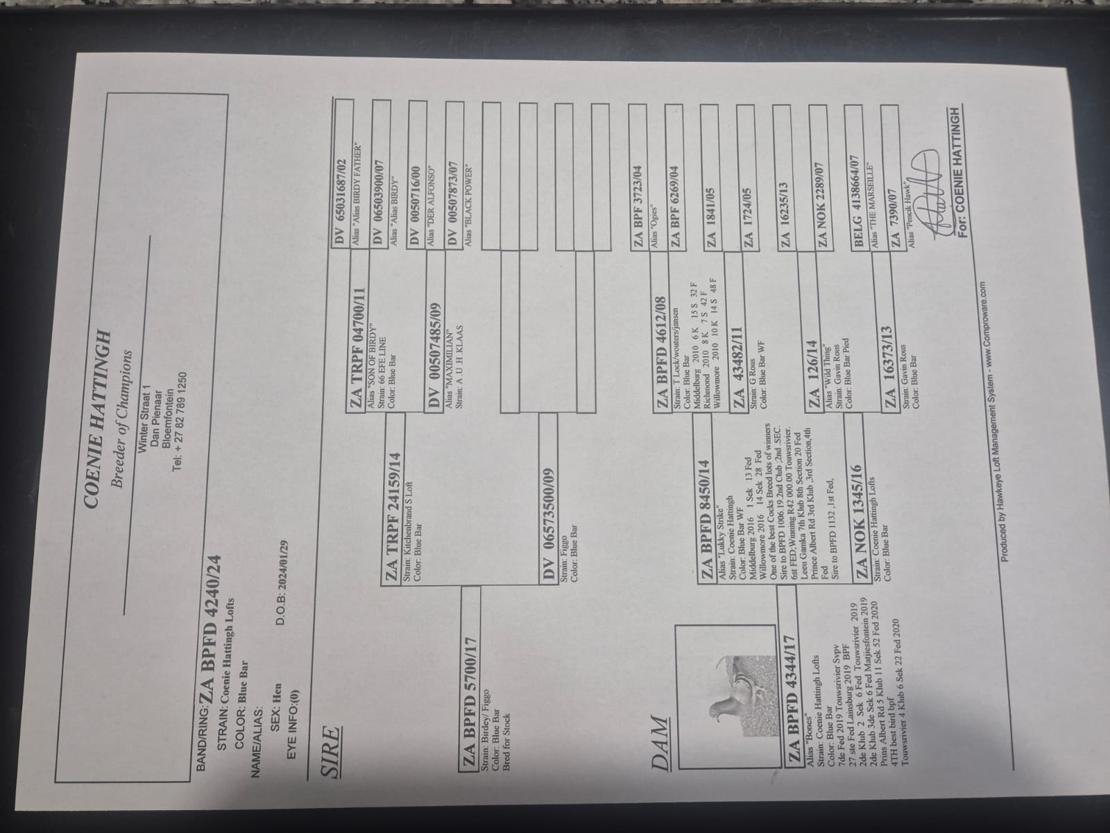LOT 59 MARLBANK OLR – FORTE & JACO FOURIE-ZA-24-GPU-4078 -2ND RACE 1 EQUAL WINNER——–SIRE:191 DAPK 21 .Alias “”FOURIE 191″” Strain: Sablon/Tom Lock Color: BB BROTHER TO EQUAL DROP WINNER CENTRAL PROVINCIAL ONE LOFT RACE!!! BREEDER OF 2ND HOTSPOT 1 MARLBANK 2025 WINNER OF R20 000: ZA GPU 24 4078.———–DAM:219 OOA 23 ZA. Alias “exclusive 810” Strain: SABLON 810/855 Color: BB linebred to legend 810 cock. Undisputed nr1 one loft breeding foundation cock. Purchased from late A. Carelsen for R75 000 This hen is rated as a 5 star breeding hen by Jaco Fourie.SEE PEDIGREE!!!