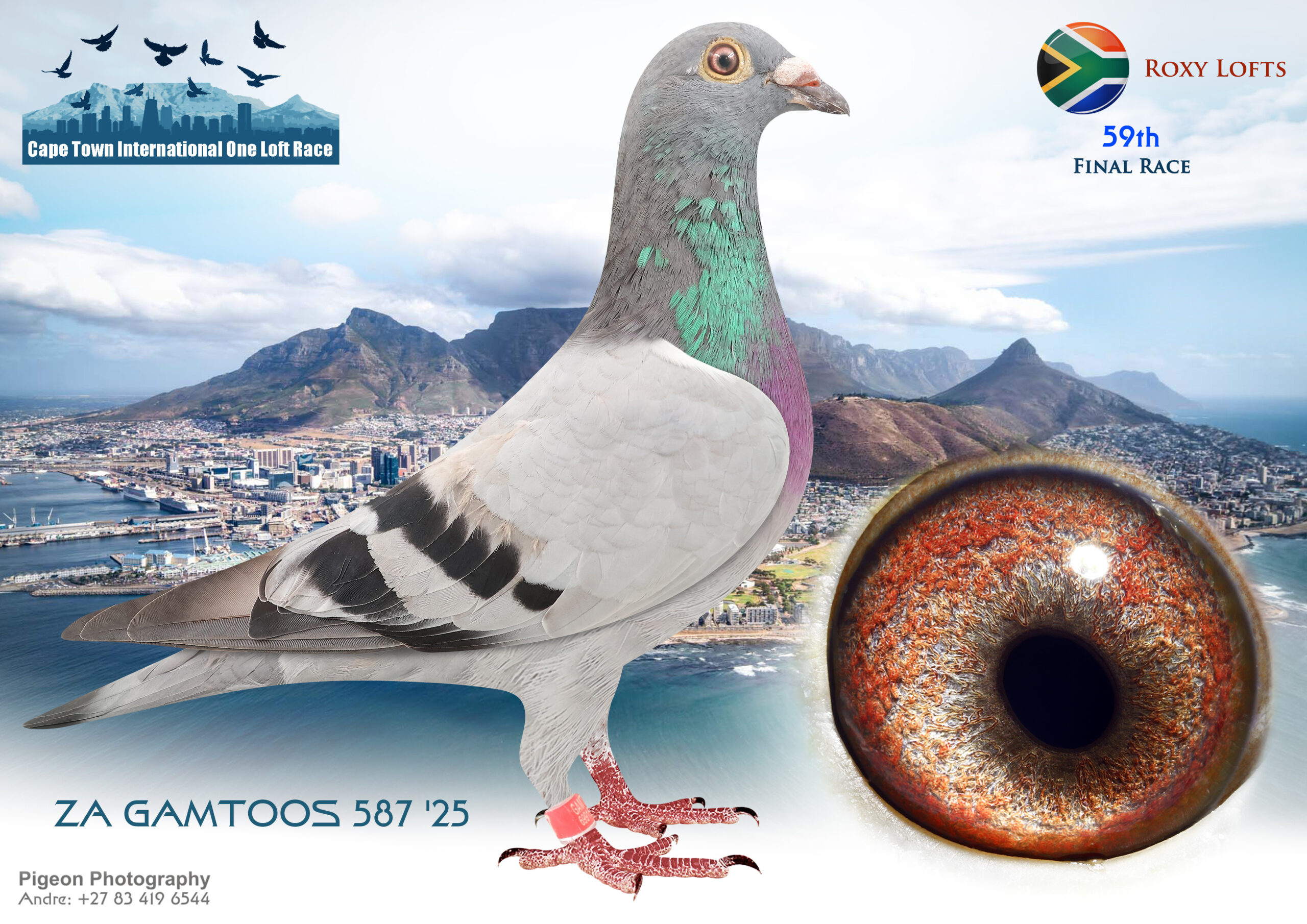 .LOT 4 CAPETOWN LOFTS – Triple J Lofts Team 3-ZA-JJJ-25-49*** -4th Final Race Winning R30 000.00 , 10th HS4 EQUAL WINNER , 8th HS2 EQUAL WINNER—————-Sire: ‘ROMU JNR’ ZA 2017 Triple J Lofts 219 Notes: ‘ROMU JNR’ is Sire of: 1. JONIQUA a super racer at the 2023 Cape Town International Pigeon race: 6th Final 450km, 2nd Hot Spot 2 226km, 2nd Hot Spot 4 180km, 18th Hot Spot 1 175km! 2. JACK a super racer at the 2026 Cape Town International Pigeon race: 4 th Final 470km, 10th Hot Spot 4 325km, & 8tth Hot Spot 2 225km 3. JAKE – 83rd Pattaya 600km Final Endurance Race 4. TOMMY (completed 2024 Carnival Gold Cup) – TOMMY bred two super racers in the 2025 Cape Town Summer Series – JEER & JUSTIFY – who were the 1st & 2nd ‘Hot Spot’ Ace Pigeons after Hot Spot 4!!! ———-DAM:Dam: ‘LUZIA’ AU 2020 GFL 168 Notes: ‘LUZIA’ is full Sister THOMAS 6 – 1st Golden Algarve Final Race! 24 Minutes Against 2,132 Pigeons From 315 Miles!! SEE PEDIGREE!!!