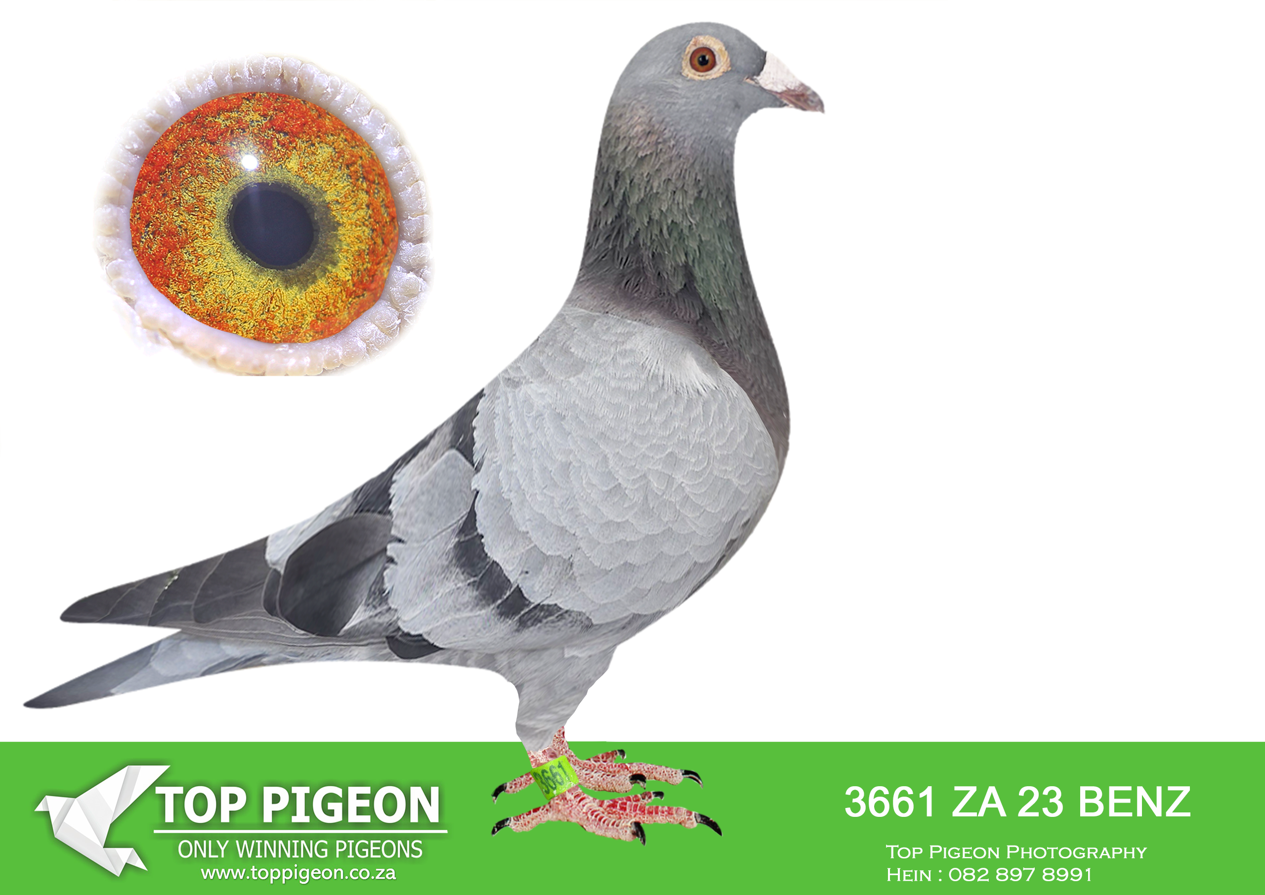 LOT 28 GLOBAL AUCTION – ZA 23 BENZ 3661 -SIRE:ZA-2014-02657 “OU MAN” Turbo Tom/Powell Blue On my return to the sport in 2017 he became my foundation cock. Comes from a long line of Union winners. When paired with 23948 of Charl Stander they bred me 0614 and 0615 that were my best stock pigeons for many years – both breeding several winners. Bred from Lot 18 and 60 at my 2015 sale. Together they bred a double winner 03320 for Wally Waldeck who in turn bred a triple winner 02864.————-DAM:ZA-2016-PWFD-2016 Christians Dark checkered BREEDER OF WINNERS!! Flew 3d Cradock for Nico van Rensburg as a yearling in 2017, then immediately taken to stock. She bred a COGG winner 3228 that won the opening race of 2025 in the YB series and 5310 that won with a break of more than 2 minutes in 2025 from Reddersburg.SEE PEDIGREE!!!