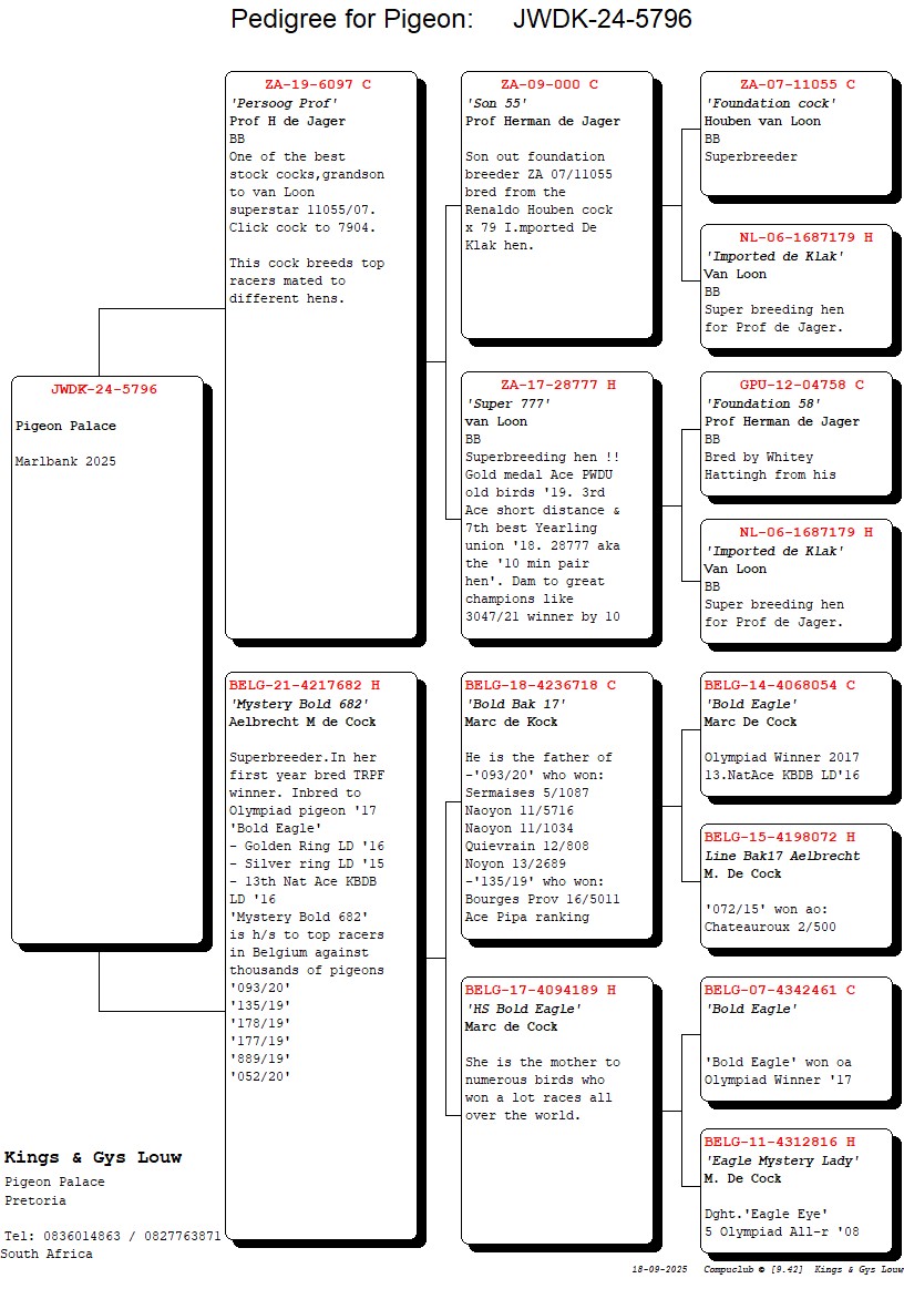 LOT 28 MARLBANK OLR – HANS & GYS-ZA-24-BENZ-5796 -SIRE:ZA-19-6097 C ‘Persoog Prof’ Prof H de Jager.One of the best stock cocks, grandson to van Loon superstar 11055/07. Click cock to 7904.———–DAM:BELG-21-4217682 H ‘Mystery Bold 682’ Aelbrecht M de Cock. Superbreeder. In her first year bred TRPF winner. Inbred to Olympiad pigeon ’17 ‘Bold Eagle’.SEE PEDIGREE!!!