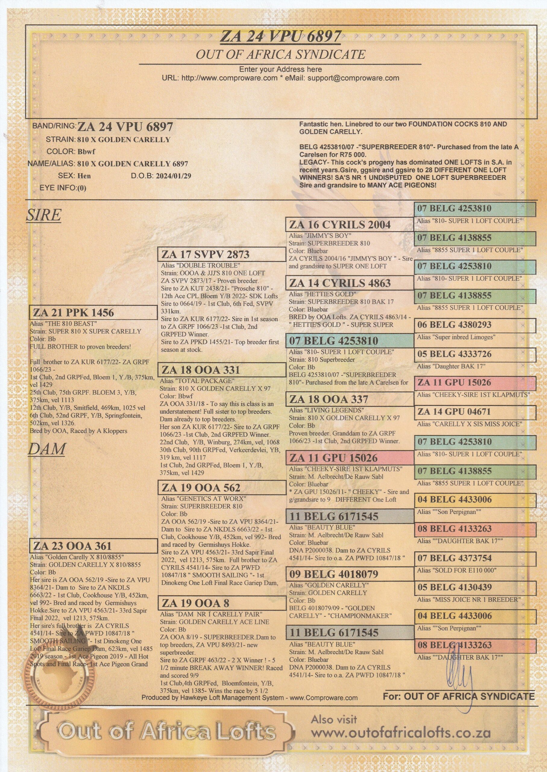 LOT 17 ANDRE ERASMUS “TSUNAMI LOFTS” – 2542 ZA BPF 24 -ONE OF ONLY TWO DAUGHTERS OF “HENNIE” , DIRECT SON OF HOTSHOT WHEN MATED TO HIS FULL SISTER.HENNIE MATED TO HIS NIECE————–Sire: 1479 ZA PWF 20 – “HENNIE” A direct son of the legendary “HOTSHOT”, one of the greatest 810 Sablon breeders in South Africa. “Hotshot” is a full brother to famous pigeons such as Fine Design, Rough Design, Pippa and Rocky, all renowned producers in the Sablon dynasty.————Dam: 4030 BPF/D 20 – “UPTOWN GIRL” A super Sablon hen and proven producer, already responsible for multiple winners and One Loft Race performers. She is a daughter of “Piano Man”, a top breeder of winners for Carel Meintjies and Dr Calitz (Postmasburg), combined with the elite Fine Design 810 Sablon line. The dam side is built around the famous 810 Sablon collection, including Boytjie and JBM’s Girl, a hen whose descendants include Dinokeng OLR Final winners and top-placed pigeons, confirming this line as one of the most successful One Loft Race families in South Africa.SEE PEDIGREE!!!!