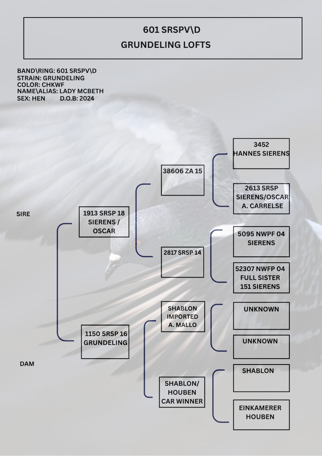 LOT 60 DINOKENG OLR – BENEKE LOFTS/TOP PIGEON-ZA KPU 24- 1609 HEN -SIRE:12180 TRPF 18. WEDDERBURN. CLUB WINNER.————DAM:12157 ZA TRPF 23 MCDERMOTT LOFTS.HER DAM IS Bred out o fAndre De Jager’s Gilders that he got from Eddie Renda 1e Club 2e Div 6e Fed Jamestown 568km 1470.934mpm.SEE PEDIGREE!!