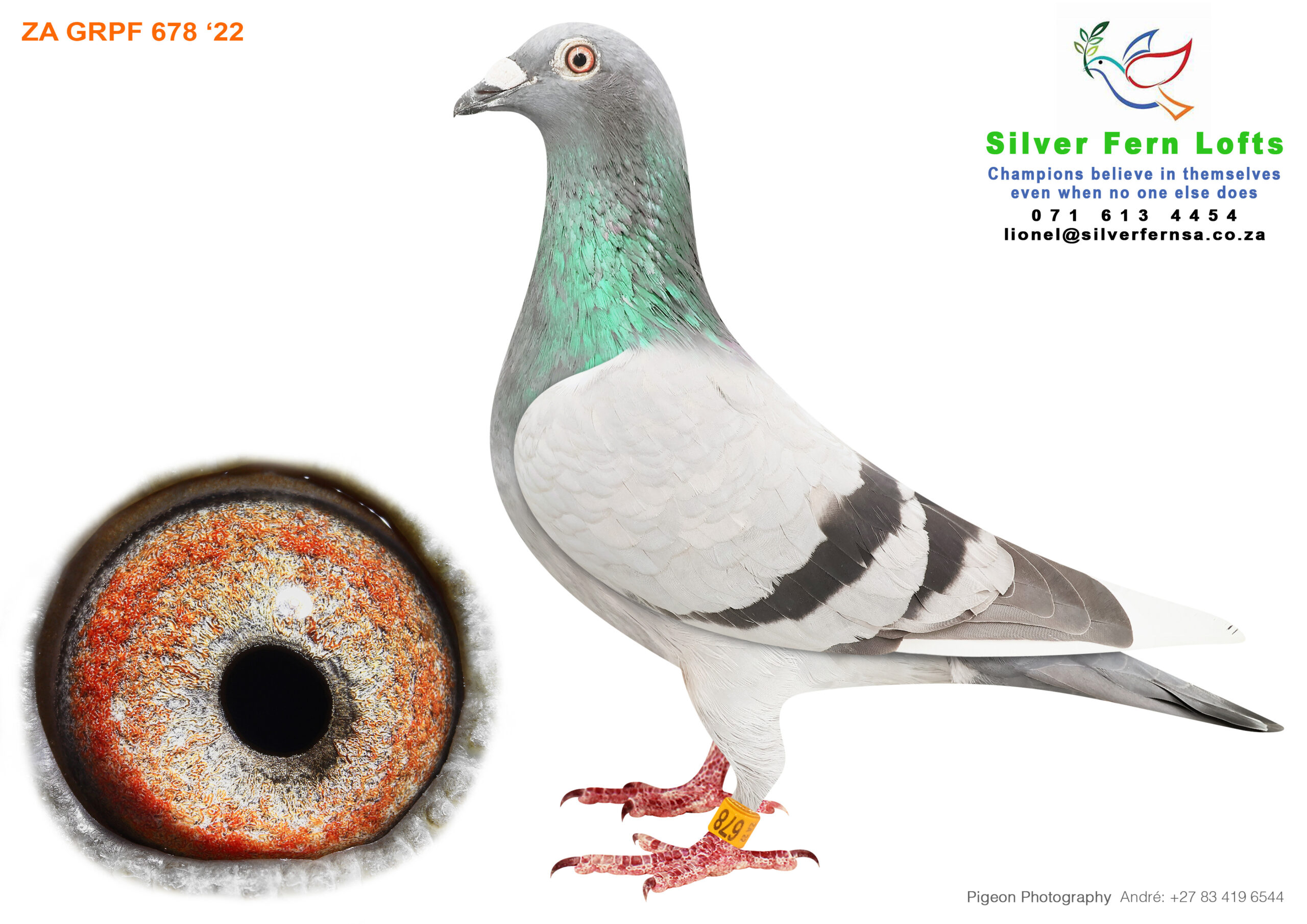 LOT 22 LEGENDS AUCTION – ZA 22 BOTHA LOFT 45 -BROKEN WING————BRED BY BOTHA LOFTS—- SIRE:8993 ZAPWDU 20. Bred from click pair, sold for R250 000. Full brother to: 08223/15; 9x top 27 PWDC; 1st 2YO, 3rd Overall; 3rd Open, 4 S/Dist bird; 11580/16; Excellent racer bred 2316/20 Cradock Union winner by 22min. 11581/16; Excellent racer bred 1313/22, Gariep Dam Union Winner. 4195/19, Verkeeerdevlei, Union winner.——DAM: 9207 ZA 20 PWDU. DIRK VAN DEN BULCK .HER SIRE IS GRANDFATHER TO TURBO KITTEL 6 X SANPO GOLD MEDAL WINNER.SEE PEDIGREE!!!