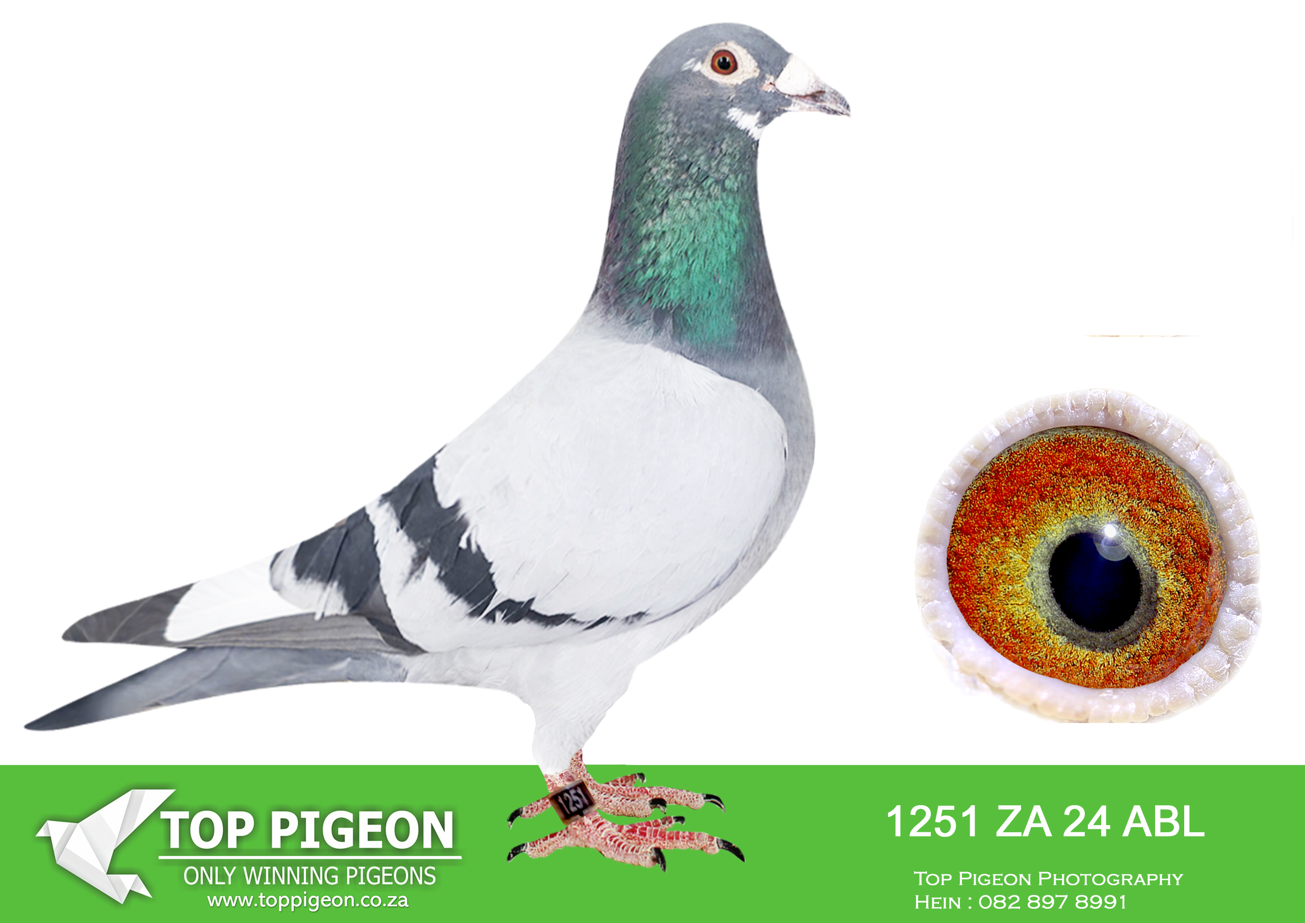.LOT 3 ALWYN BESTER – ZA 24 ABL 1251 -This pigeon is super bred. Bred from the full brother to Five Star and many more winners mated to the dam of AMIRA and many great racers for other fanciers.———–SIRE:944 ZA 23 ABL .Strain: Alwyn Bester Color: Blue Bar W/F Full brother to: FIVE STAR, Green Jacket Winner AFRIKAPRO. DYNASTY, Grand Average Winner DINOKENG OLR 2022 2nd Ace Pigeon DINOKENG 2022 3rd Final DINOKENG 2022 GPU 4929 Best Pigeon Overall GPU 2023 ABL 1332. Best Middle Distance Pigeon PWDU 2023 ABL 343 PWDU Winner 2022 ABL 913 Gauteng Winner Gariep 2024.—————DAM:31735 GB 19 P .Alias “ROSY” Strain: Dirk Van Den Bulck Color: BLUE BAR PIED Inbred back to KITTEL and his famous parents. GOEDE RODE and OLYMPIC ROSITA are the foundation birds from the Dirk van den Bulck dynasty. ROSY has bred numerous winners the last three years. The exeptional one is ZA ABL 643 2022 4 x PTA UNION WINNER 9 x Club Winner SANPO GOLD ALL DISTANCES 2001+pigeons 2024.SEE PEDIGREE!!!