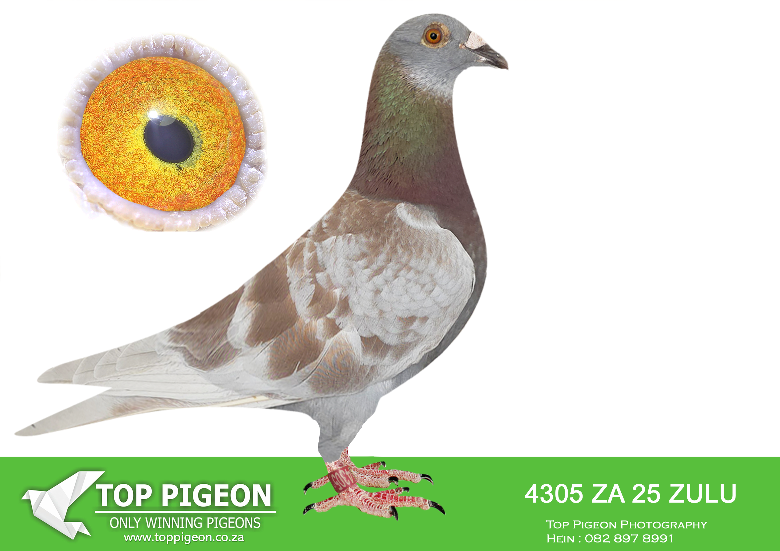 LOT 13 BADENHORST HOKKE – ZA 25 ZULU 4307 -SIRE:116 22 NHL..Alias “Blue” Strain: 810 SANPO Gold Medal Line Color: Blue Bar “BLUE” super pigeon bred for stock. Perfect bird. His sire and dam are both super breeders for us. 06980 is probably one of the best 810 super breeder hens in the country. NHL 116/22 sire to 3rd ace Carnival 2024. Half brother on dams side to equal winner 4th place Dinokeng Barzalona race 2019, 2nd place Barzalona 2020, SANPO gold medal long distance 2018. ————-DAM:72 22 NHL.Strain: TOM LOCK X 810 Color: Check W/F Full sister to equal winner 4th place Dinokeng Barzalona race 2019. full sister to 2nd place Barzalona 2020. Full sister double SANPO gold medal long distance 2018. Nest mate to super breeder NHL1039/17. Half sister to Alwyn Bester’s ZULU 2533/20 who is sire to SANPO gold 2001+ pigeons 2024. Full sister to Jaco & Danies “Ball of Gold”.SEE PEDIGREE!!!