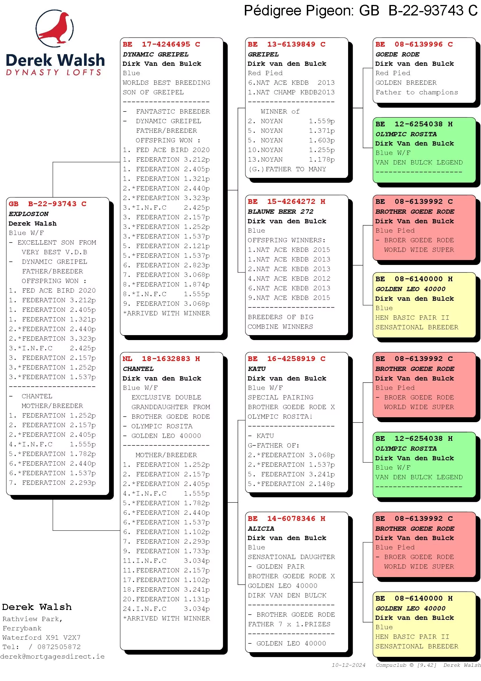 .LOT 3 KITTEL AUCTION – GB 22 B 93743 -“EXPLOSION” ORIGINAL DEREK WALSH -EXCELLENT SON FROM VERY BEST V.D.B DYNAMIC GREIPEL.————-SIRE:BE 17-4246495 C DYNAMIC GREIPEL Dirk Van den Bulck Blue WORLDS BEST BREEDING SON OF GREIPEL.FANTASTIC BREEDER DYNAMIC GREIPEL FATHER/BREEDER OFFSPRING WON : 1. FED ACE BIRD 2020. 1. FEDERATION 3.212p. 1. FEDERATION 2.405p. 1. FEDERATION 1.321p. 2. FEDERATION 2.440p. 2. FEDEARTION 3.323p.———–DAM:NL 18-1632883 H “CHANTEL”.Dirk van den Bulck Blue W/F EXCLUSIVE DOUBLE GRANDDAUGHTER FROM BROTHER GOEDE RODE OLYMPIC ROSITA GOLDEN LEO 40000.SEE PEDIGREE!!!!