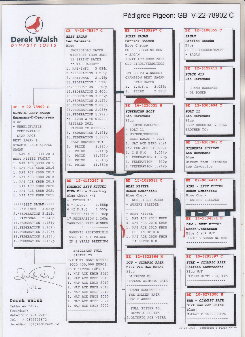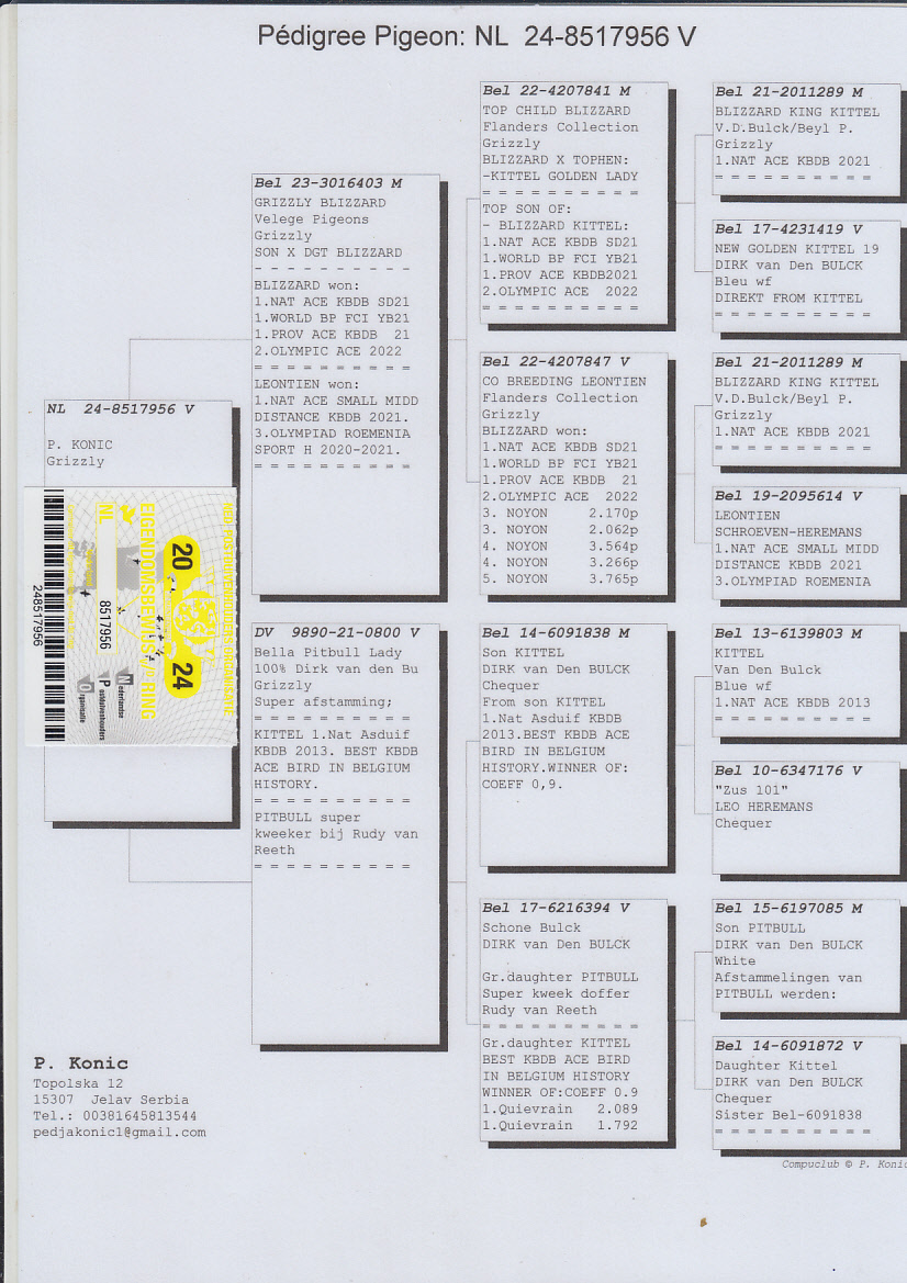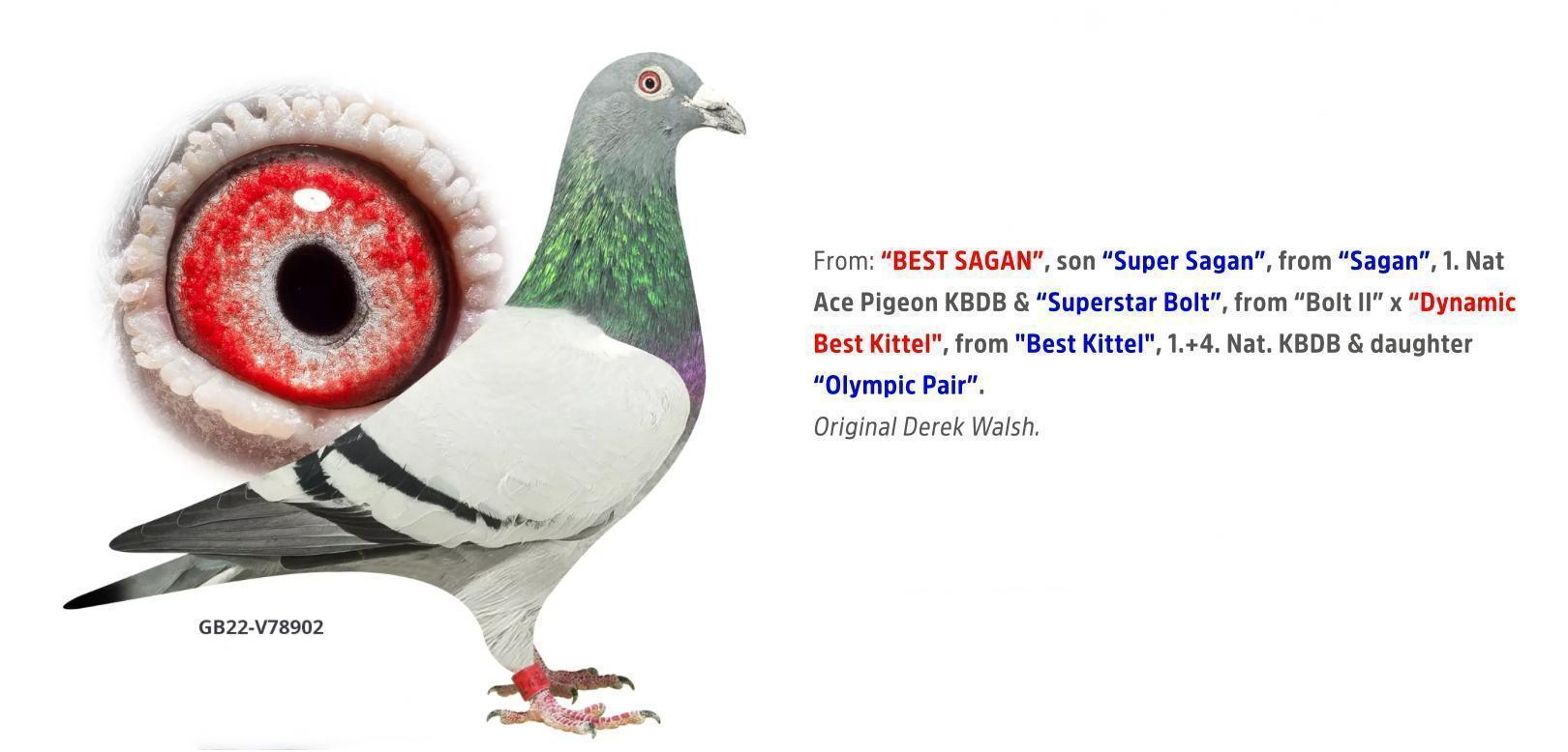 .LOT 3 MIKE ENGELBRECHT -ZA 26 ME BULLCAT 66 -SIRE:GB V-22-78902 C OLYMPIC BEST SAGAN Heremans-D-Demonseau. – UNBELIEVABLE COMBINATION. STAR RACE , BEST SAGAN & DYNAMIC BEST KITTEL SAGAN.———DAM:NL24-8517956 V. GRIZZLY.SIRE IS Bel 23-3016403 M GRIZZLY BLIZZARD Velege Pigeons Grizzly SON X DGT BLIZZARD. DAM IS 9890-21-0800 V Bella Pitbull Lady 100% Dirk van den Bu Grizzly Super afstamming; = = = = = = = KITTEL 1.Nat Asduif KBDB 2013. BEST KBDB ACE BIRD IN BELGIUM HISTORY..SEE PEDIGREE!!!