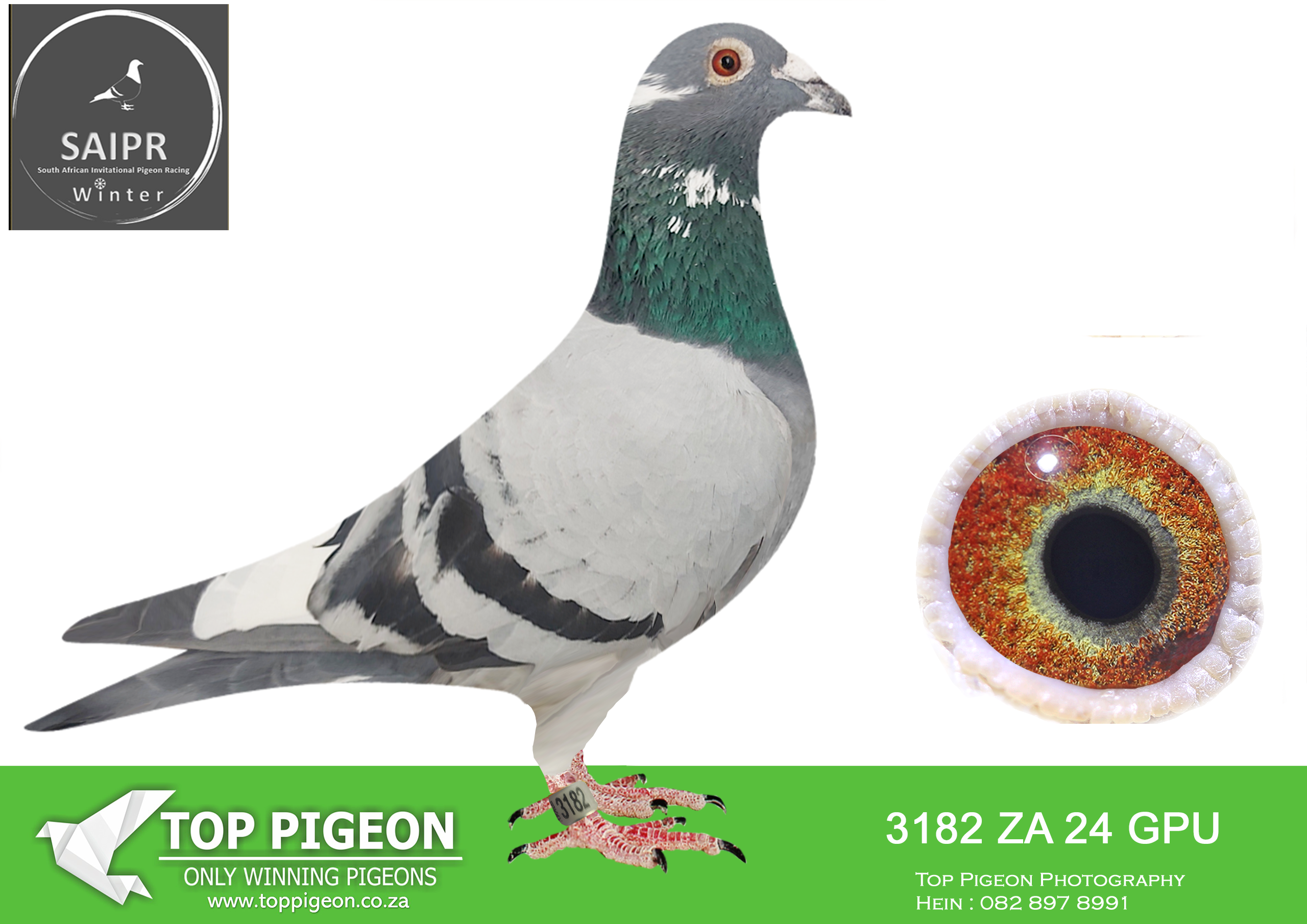 .LOT 3 SAIPR AUCTION A – Hans de Noon- za gpu 24 3182*** -SIRE:5752 ZA 22 GPU .Strain: Morey Tom Lock R80 000 Color: Blue Bar .————-DAM:1151 ZA 23 ABL.Strain: Dirk Van Den Bulck Color: Blue Bar Pied. HALF SISTER TO SANPO GOLD MEDAL WINNER “AMIRA” WHICH WERE SOLD FOR R252 000.00 ON TOPPIGEON!!!!