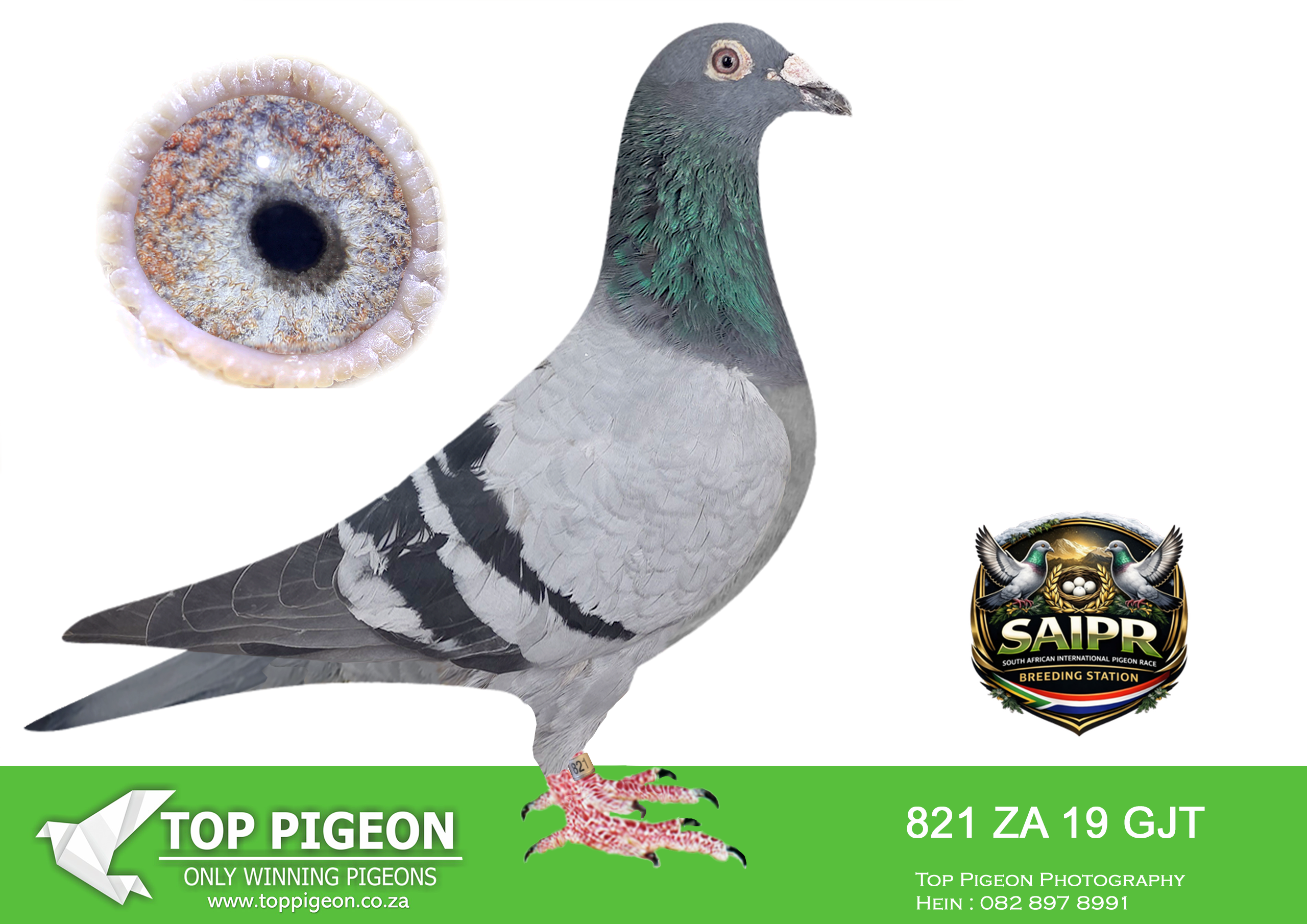 LOT 32 SAIPR BREEDING STATION – 974 ZA 20 GJT -17TH ACE BIRD CAPETOWN IOLR 2021———-SIRE: “CARELLI’S BEST” (Bak 17 Line) A top-class breeding cock built from the elite Bak 17 × Carelli Sablon foundation, known for producing consistent winners. He carries the blood of proven performers like “Mr Joy” (05891 GPU 13 ZA) – a top Verbesselt-based breeder responsible for multiple race winners, including performances in Million Euro & Taiwan races. On the dam side of the sire we find “Carelli Ace Line” (05777 GPU 13 ZA), a daughter of multiple winner breeders, reinforcing the Carelli Sablon strength. This cock is tightly bred to a powerful combination of De Rauw Sablon, Aelbrecht, and Bak 17, with influence from “Lucky Freddy” and “Marcelina”, both known for producing OLR super racers and high-performing progeny.————DAM: Direct KAASBOER Dynasty (Nr 1 Hen Line) An exceptional hen bred from the very best Kaasboer blood in South Africa, directly linked to the legendary “Gold Gouda P1600189” and “Kiran P1600177”. “Gold Gouda” – Nr 1 Kaasboer cock in SA, sire to a 7x winner, 3rd SAPIR, and multiple top performers. “Kiran” – Nr 1 Kaasboer hen in SA, dam of 7-time winners, SAPIR performers, and several proven breeders. This hen originates from the famous MC Hansen Kaasboer stud (Denmark), combining “Koe Oog” and “Bon Duivin”, two of the most influential Kaasboer pigeons ever imported. 👉 A powerhouse dam line known for consistency, durability, and top-level winning ability across generations.SEE PEDIGREE!!!
