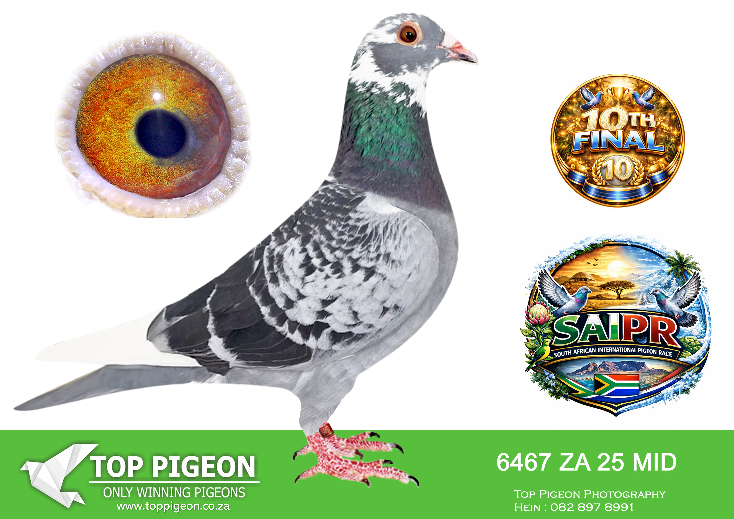 LOT 23 SAIPR SUMMER AUCTION 1 – Theuns Victor- VICTOR 108 2025 -4TH FINAL WINNING R90 000.00——-SIRE:483 ZA 19 OOA .Alias “MR WOW” Strain: Tom Lock/Sablon Color: Blue Bar SUPER RACER 8 WEEKS IN A ROW FOR OOA LOFTS!! 7th Club, 18th VPU, Glen, Y/B, 286km, 1369mpm – 1993 pigeons 11th Club, 47th VPU, Tom’s Place, Y/B, 323km, 1416mpm – 2113 pigeons 49th Club, 152nd VPU, Springfontein, Y/B, 424km, 1014mpm————DAM:6493 ZA 21 KUR.Strain: Sablon/Tom Lock Color: Blue Bar.SEE PEDIGREE!!!!