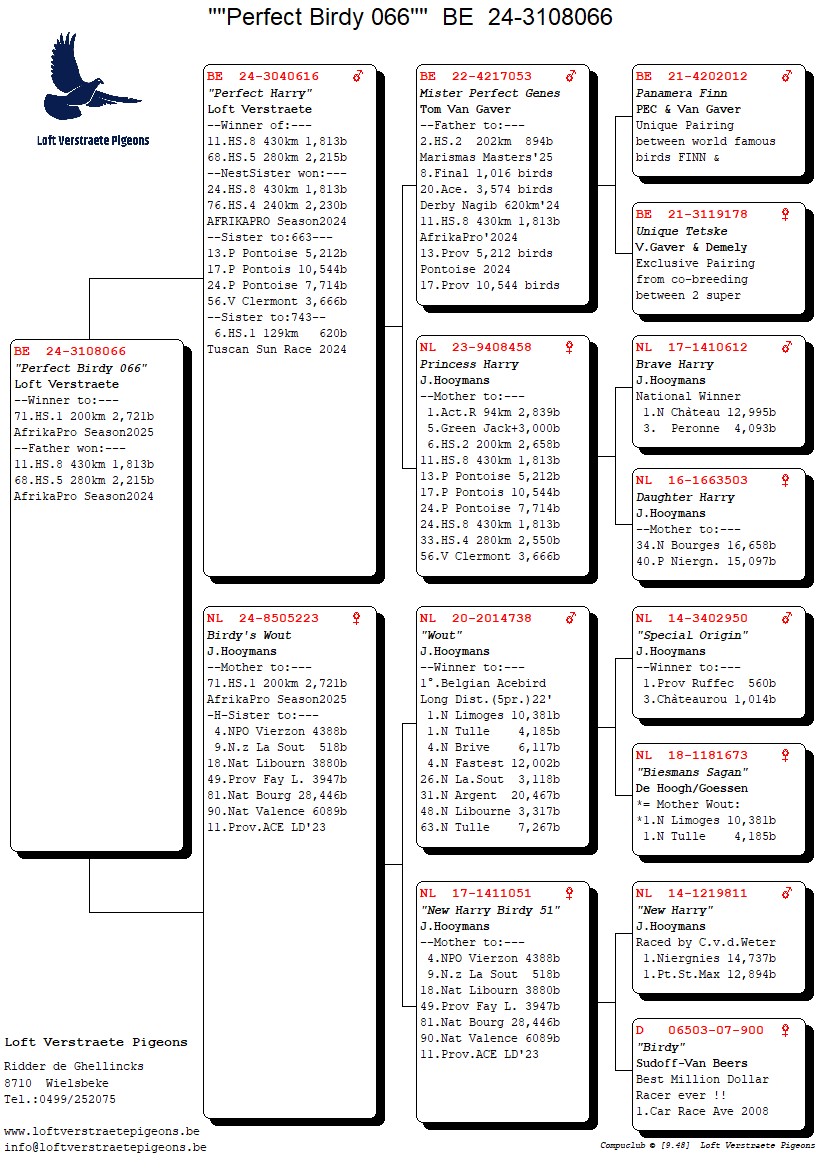 LOT 30 AFRIKAPRO AUCTION 3 – Loft Verstraete – Brantegem 2-BE-24-3108066 -SIRE:24-3040616 “Perfect Harry” Loft Verstraete –Winner of:— 11. HS.8 430 km 1,813b, 68.HS.5 280km 2,215b, –NestSister won:— 24. HS.8 430km 1,813b, 76.HS.4 240km 2,230b, AFRIKAPRO Season2024 –Sister to: 663— 13.P Pontoise 5,212b, 17.P Pontois 10,544b, 24.P Pontoise 7,714b, 56.V Clermont 3,666b, –Sister to:743– 6. HS.1 129km 620b, Tuscan Sun Race 2024.————-DAM:NL 24-8505223 Birdy’s Wout J.Hooymans.–Mother to:— 71. HS.1 200km 2,721b AfrikaPro Season2025. -H-Sister to:— 4.NPO Vierzon 4388b, 9.N.z La Sout 518b, 18. Nat Libourn 3880b, 49. Prov Fay L. 3947b, 81. Nat Bourg 28,446b, 90.Nat Valence 6089b, 11. Prov.ACE LD’23.SEE PEDIGREE!!!!