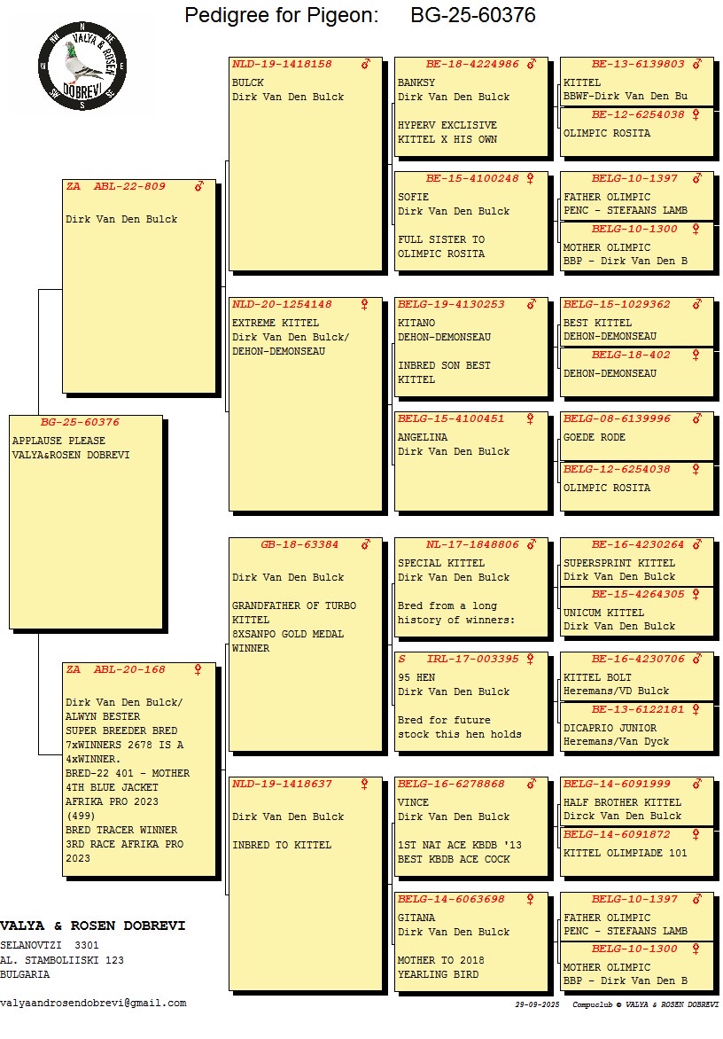 LOT 30 AFRIKAPRO AUCTION 4 – Valya & Rosen Dobrevi-BULGARIA-25-60376 -22ND RACE 8———-SIRE:ZA ABL-22-809. ALWYN BESTER KITTEL.THIS IS A DIRECT GRANDCHILD TO “ANGELINA” WHICH IS A SISTER TO KITTEL———-DAM:168 ZA ABL 20 Colour: MEAL. DIRK VAN DEN BULCK /ALWYN BESTER. ABL 168 WERE SOLD FOR R242 000.00 ON TOPPIGEON.SUPER BREEDER .BRED 7 X WINNERS .2678 IS A 4 X WINNER. BRED -22 401 – MOTHER 4TH BLUE JACKET AFRIKA PRO 2023 (499). BRED TRACER WINNER 3RD RACE AFRIKA PRO 2023 BRED -23 430 WINNER GAUTENG COMB.SEE PEDIGREE!!!